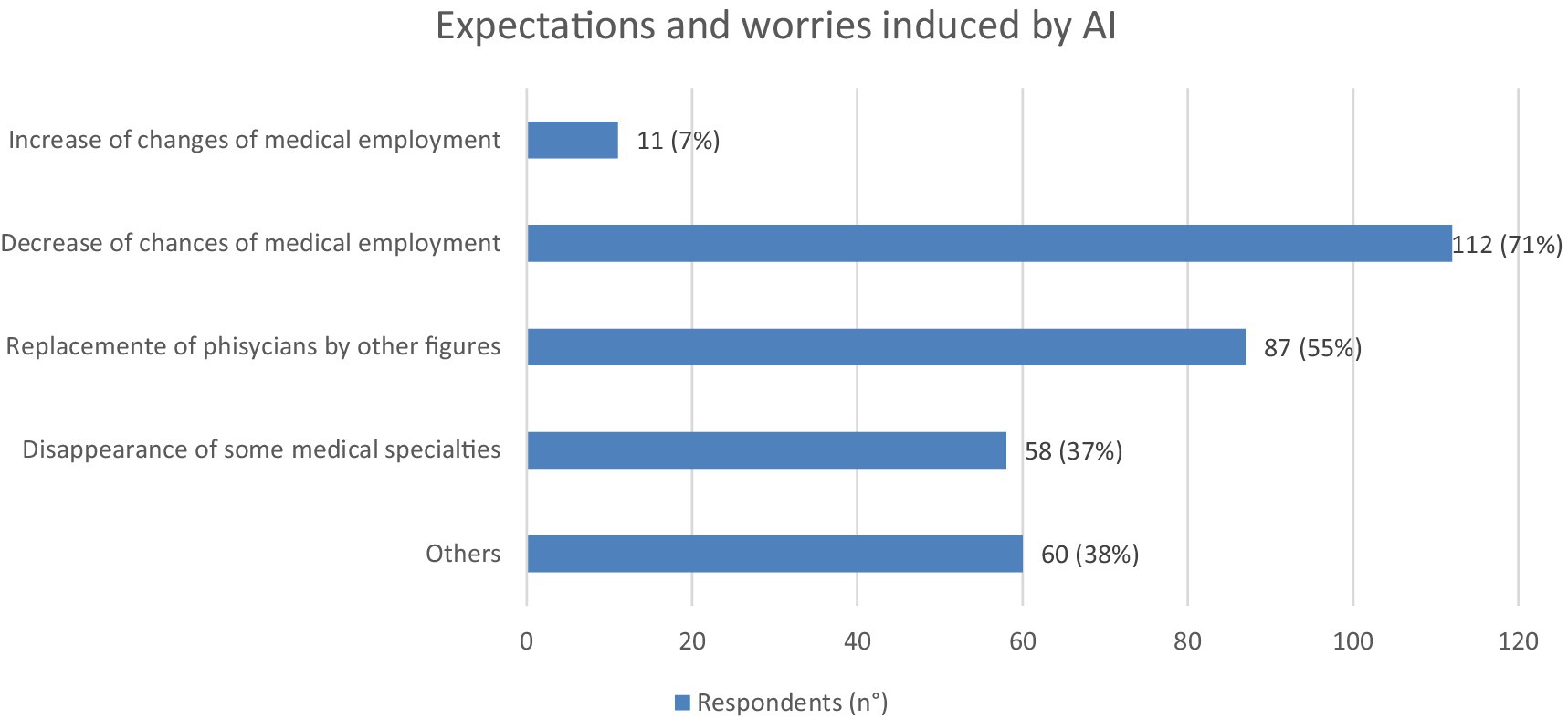 Figure 6. Graphic representation of expectations and worries induced by AI in physicians interviewed (N = 158), each of whom was asked to indicate their three main perceived consequences. Values shown next to each bar represent the number of respondents who selected that option, with the corresponding percentage in parentheses. The most expectations was the decrease of chances of medical employment (N = 112); on the other hand 11 expect an increase of chances of medical employment. Not all respondents indicate three preferences.