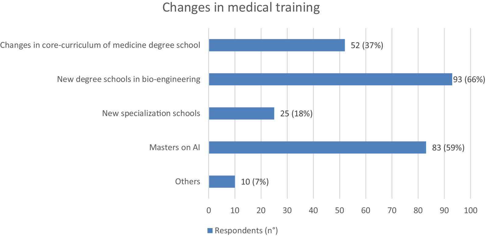 The 87% of the interviewees believe that the medical training will have to be modified as a consequence of the impact of AI and, among these, the indications prevailing are the need to establish new degree schools in bio-engineering: 93 (66%), masters on the topic of AI: 83 (59%) and to modify the core curriculum of the Study Course in Medicine and Surgery: 52 (37%) (Figure 7).