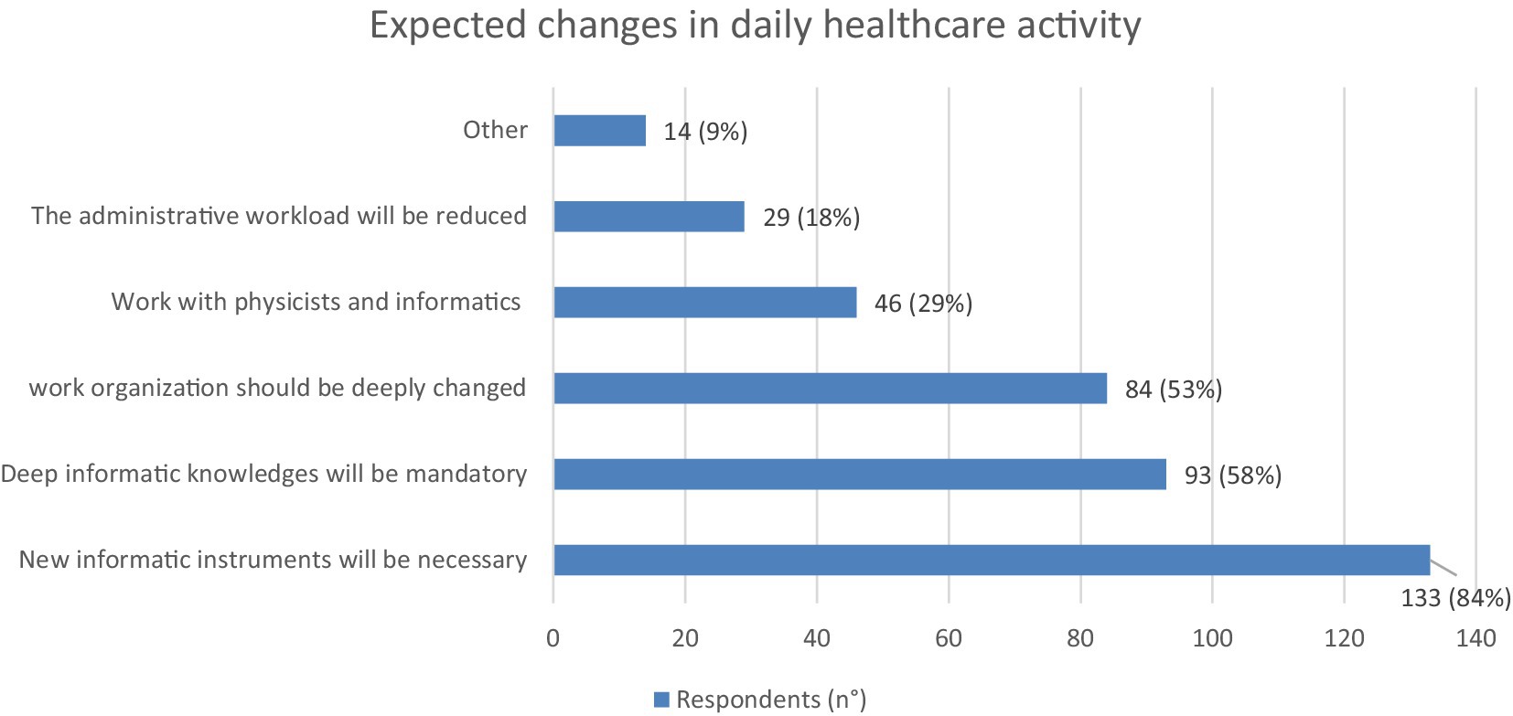 Figure 8. Graphic representation of the expected changes that the responders (N = 159) think will be caused in their daily healthcare activity by implementation of AI. Each respondent was asked to indicate up to three points. Values shown next to each bar represent the number of respondents who selected that option, with the corresponding percentage in parentheses. 133 respondents believe that they are necessary new informatics instruments and 93 that deep informatics knowledges will be mandatory.