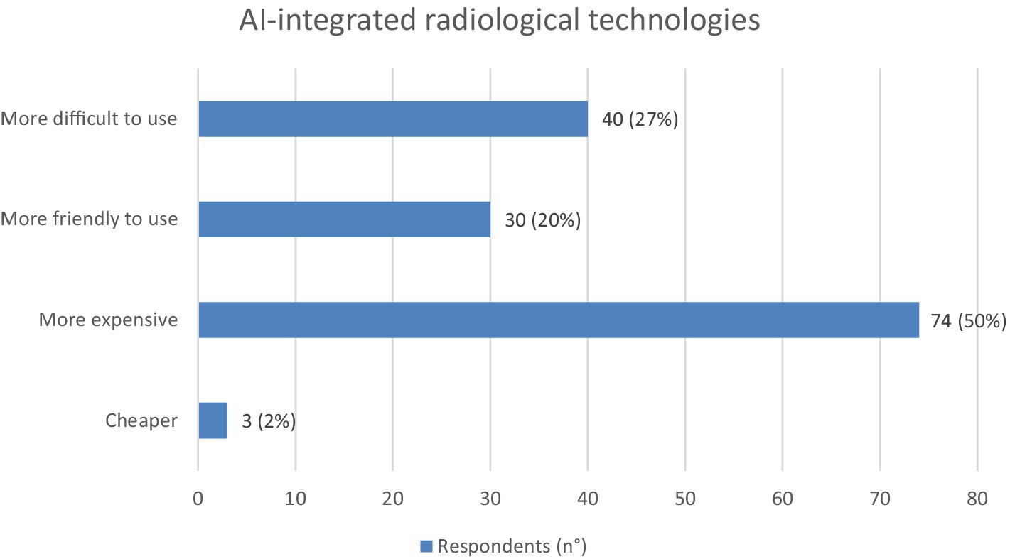 Figure 9. Graphic representation of how the respondents (N = 147) imagine new AI-integrated technologies. Values shown next to each bar represent the number of respondents who selected that option, with the corresponding percentage in parentheses. 74/147 interviewees believe that these new technologies will be more expensive.