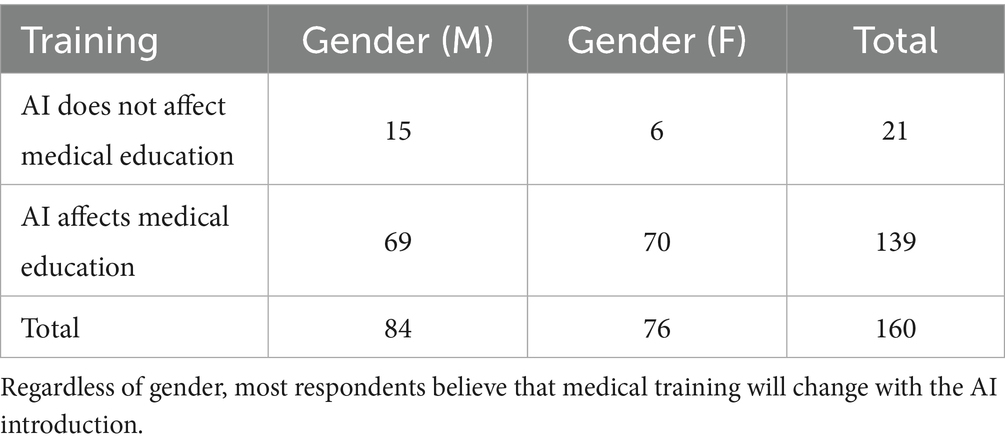 Table 1 highlights that the majority of individuals, regardless of gender, believe that the training of the doctor will undergo changes due to the introduction of AI: 139 out of 160 individuals (about 87%). This value is fairly balanced between the two genders (69 men and 70 women). On the contrary, there is a notable difference in the group of those who think that the training path will not undergo changes, where the male group has more individuals (15/21 = 71.4%) than the female group (6).