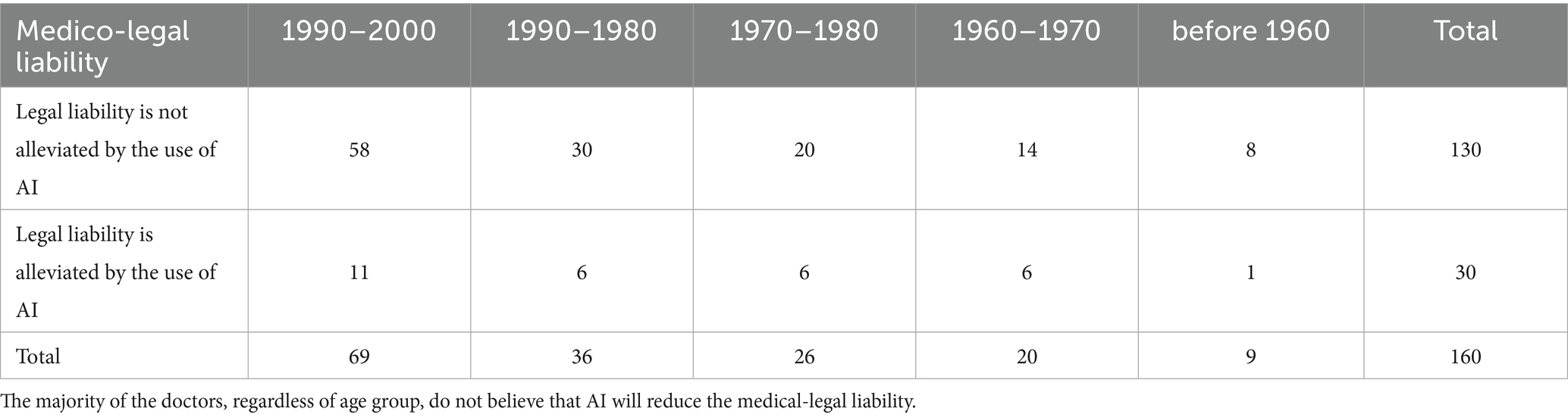 Table 3 shows that the majority of doctors, regardless of age group, do not believe that AI will reduce medical-legal liability (130 out of 160 Doctors, equal to 81.25%). However, there are 30 doctors (18.75%) who think that AI will have a positive impact in this sense. In particular, the youngest group (group 1, born between 1990 and 2000) is more likely to think that AI can ease medical-legal liability than older age groups: 11/69 (15.9%) in this group share this opinion. On the contrary, among doctors born before 1960 (group 5), only 1/9 (11.1%) believe that AI will reduce medical-legal liability.