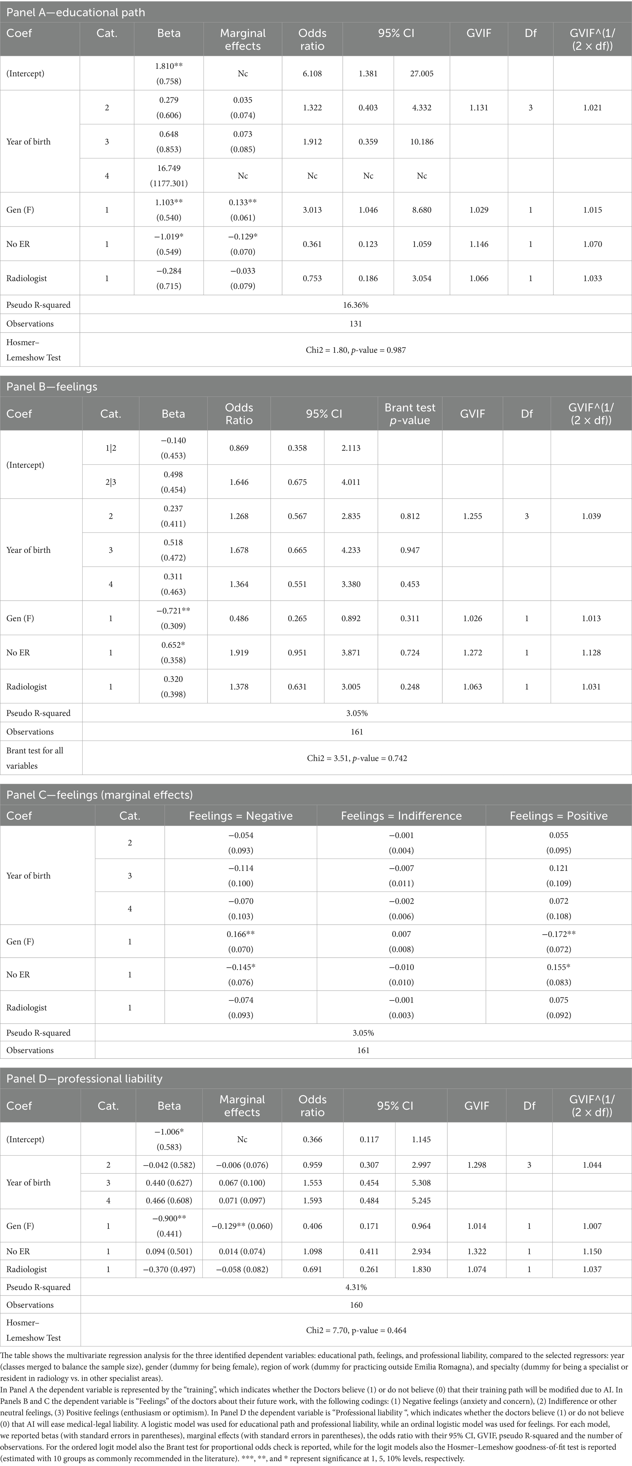 The results of the multivariate analysis are reported in Table 4. From Panel A it emerges that gender has a 5% statistically significant association with the belief that doctors’ training path will be modified due to AI, with women being, on average, 13.3 percentage points more likely than men to hold this belief, after controlling for all the other regressors. Instead, physicians practicing in a region different from Emilia Romagna are, on average, 12.9 percentage points less likely (at 10% significance level) to believe that medical training will undergo changes due to the introduction of AI. The year of birth and being a radiology specialist or resident are not statistically significant, therefore there does not seem to be a different perception about the effect of AI on training between Doctors and radiology trainees and other types of specialists or trainees or on the basis of age. Panel B and Panel C investigate physicians’ different feelings (negative, neutral, positive) about their own future career due to AI and show that women are more likely (at 5% significance level) to have negative feelings (i.e., anxiety or worry), whereas doctors outside Emilia Romagna are marginally more likely to have positive feelings (i.e., enthusiasm or optimism). Specifically, being female is associated with a 16.6 percentage point increase in the probability of expressing negative feelings and with a 17.2 percentage point decrease in the probability of expressing positive feelings. On the contrary, practicing outside Emilia Romagna is associated with a 14.5 percentage point decrease in the probability of expressing negative feelings and with a 15.5 percentage point increase in the probability of expressing positive feelings. Again, the year of birth and being a radiology specialist or resident do not show a statistically significant association. Hence, female physicians are more likely than men to believe in a change in their training path due to AI and to be more pessimistic about AI consequences in their future career, confirming impressions emerging from Tables 1, 2. Finally, Panel D shows that gender is the only variable showing statistical significance with professional liability, implying that women are, on average, 12.9 percentage points less likely than men to feel that AI will ease medical-legal liability. This evidence does not confirm impressions emerging from Table 3, which, instead, suggest a relation between professional liability and physician’s age. Overall, the analyzed independent variables partially explain the variations in physicians’ opinions. The low pseudo R-squared value in the feelings and professional liability models suggest that, beyond the analyzed variables, other factors may influence the different spectrum of sensations related to AI. The other factors, not analyzed in this study, are likely to be related to individual personality traits or differences connected to degree of integration of AI into the work environment and daily lives of respondents.3 However, for the ordered logit model, used to investigate physicians’ different feelings about their own future career due to AI, the Brant test does not reject the proportional odds assumption, confirming that the ordered logit specification is appropriate. Moreover, in the logit models for Educational path and Liability, the Hosmer–Lemeshow goodness-of-fit test indicates no evidence of lack of fit, suggesting that the logistic regression model provides an adequate representation of the data.