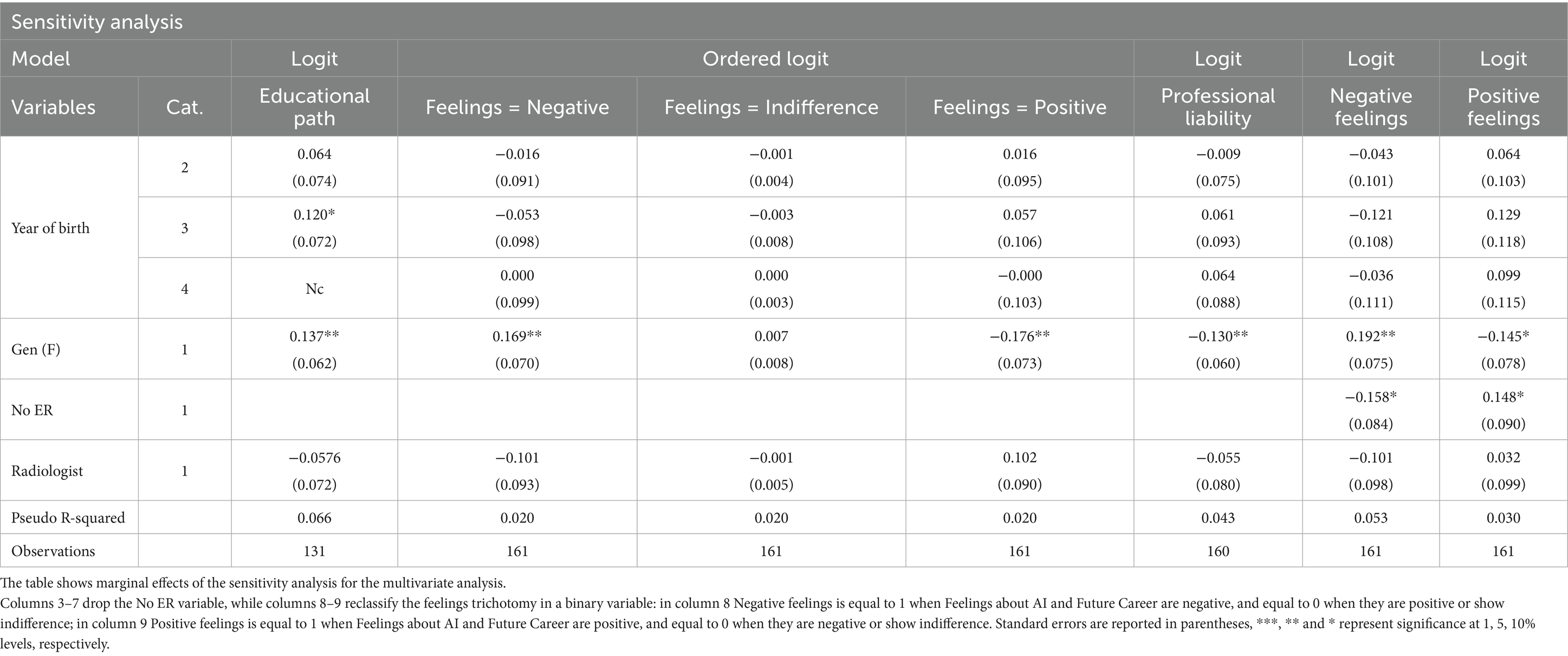 Table 5 reports the results of a sensitivity analysis conducted along two main lines. First, we exclude the No ER variable from the specification of the models. Second, we adopt two alternative redefinitions of the Feelings variable as a binary indicator: (i) the new variable “Negative feelings” is equal to 1 when Feelings about AI and Future Career are negative, and equal to 0 when they are positive or show indifference; (ii) the new variable “Positive feelings” is equal to 1 when Feelings about AI and Future Career are positive and equal to 0 when they are negative or show indifference.
