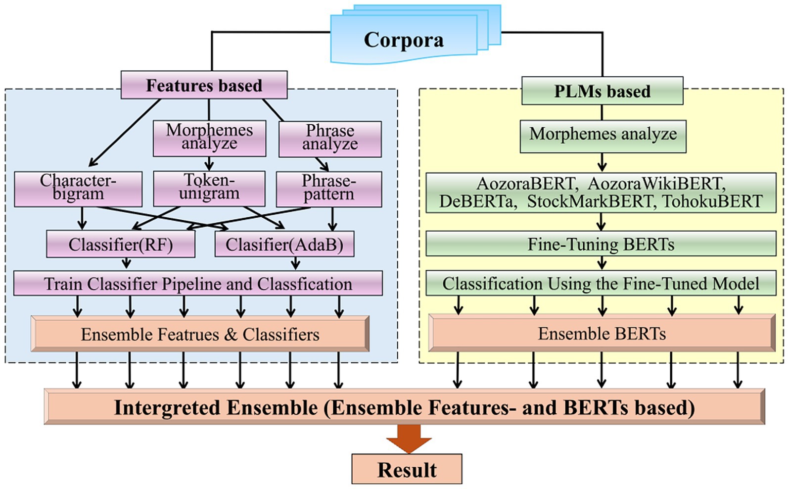 We classified two corpora using multiple models composed of BERTs and features-based classifiers; then, we applied an integrated ensemble of BERT- and feature-based models to the classification results. The workflow of this study experiment is shown in Figure 1.
