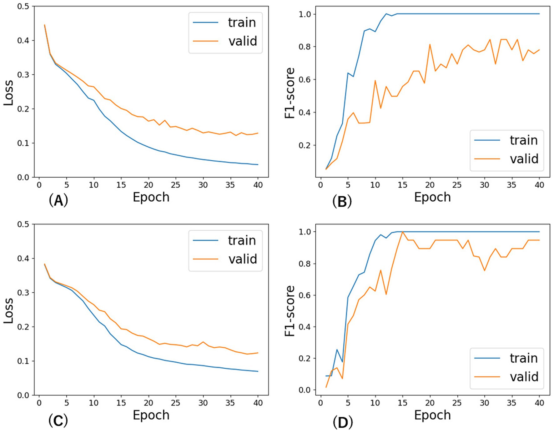 Figure 2. Learning curves of F1 score and loss across epochs for TohokuBERT and DeBERTa on CorpusB. (A) Loss vs. epochs for TohokuBERT, (B) F1 score vs. epochs for TohokuBERT, (C) Loss vs. epochs for DeBERTa, (D) F1 score vs. epochs for DeBERTa.
