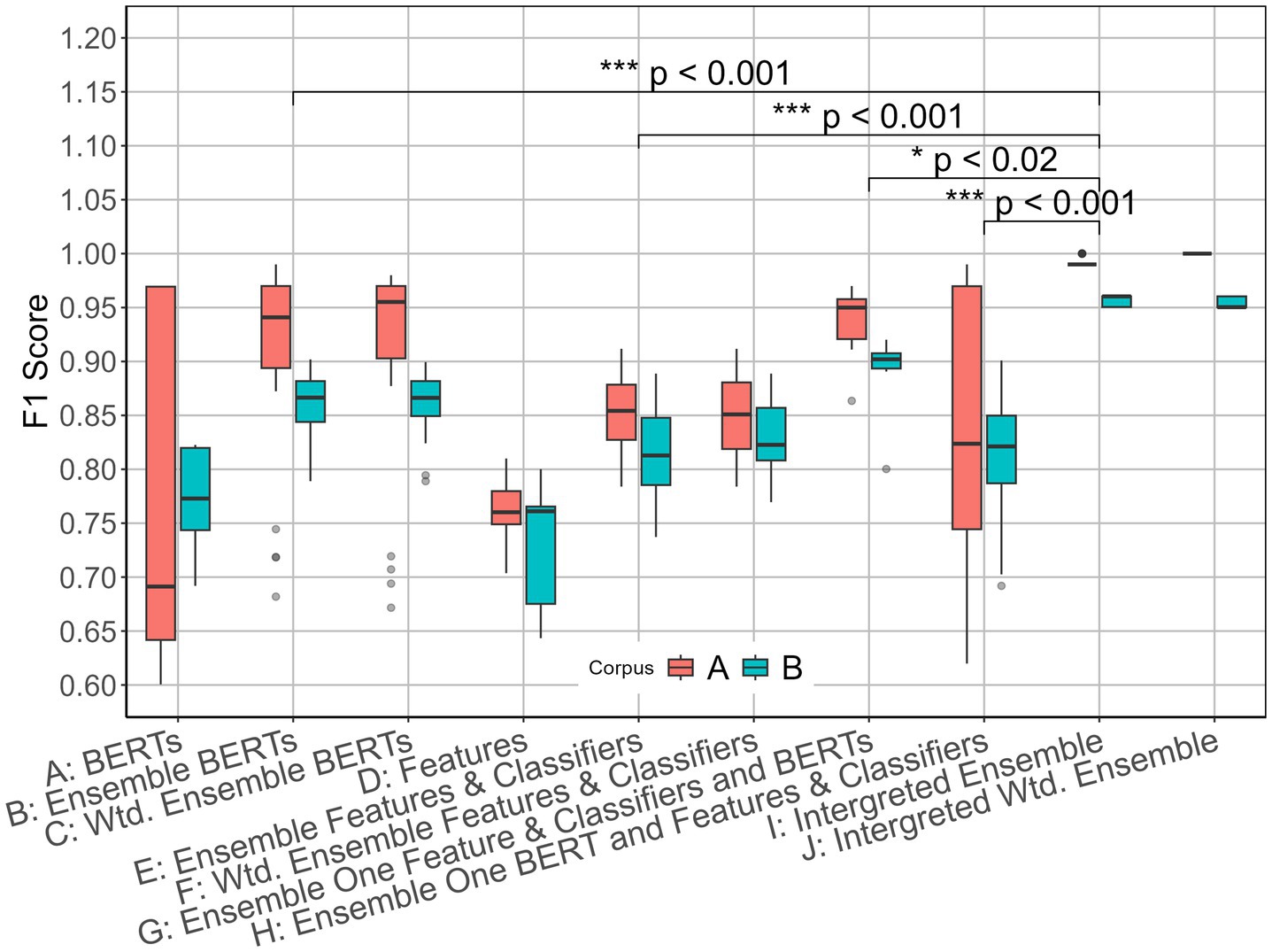 For Corpus B, the integrated ensemble results were 13.7 and 16 points higher than the highest scores of the standalone BERT model (0.823) and the feature-classifier combinations (0.800), respectively. Additionally, the score was 5.8 and 7.1 points higher than the best results of the BERT model ensemble (0.902) and the feature-classifier ensemble (0.889), respectively. Thus, the integrated ensemble significantly outperformed the individual models on both corpora. This result also surpasses that of an ensemble of multiple BERT models with a single feature set, or a single BERT model with multiple classifiers.