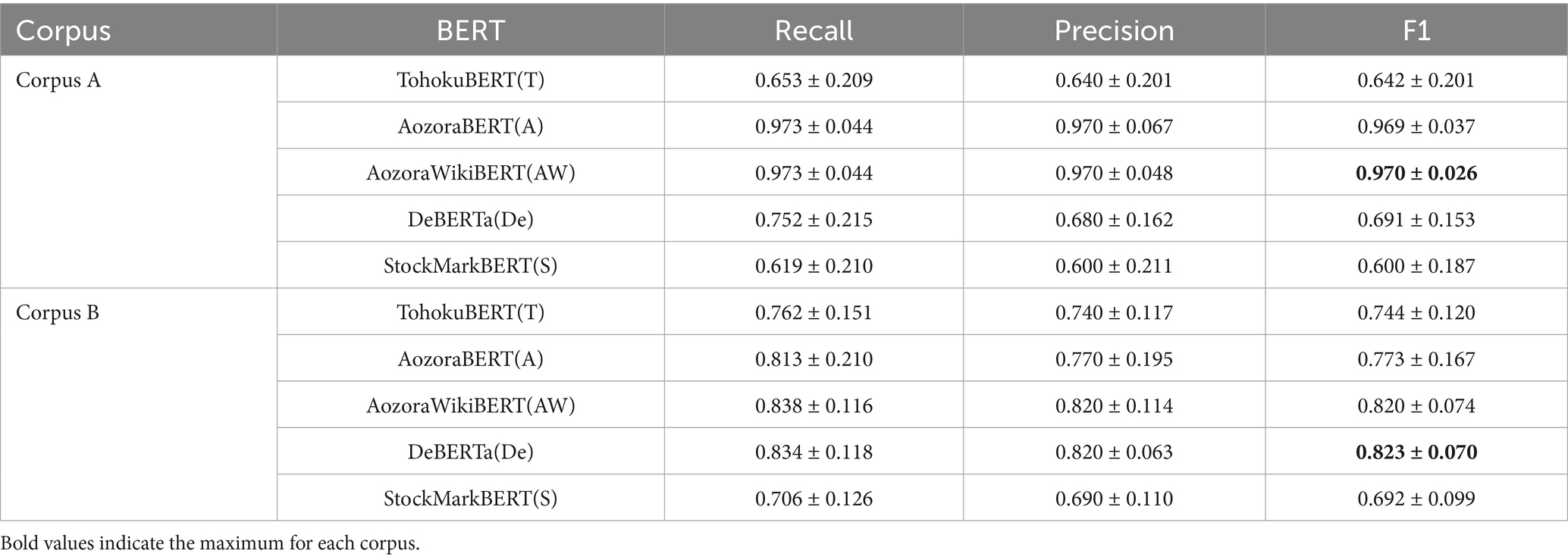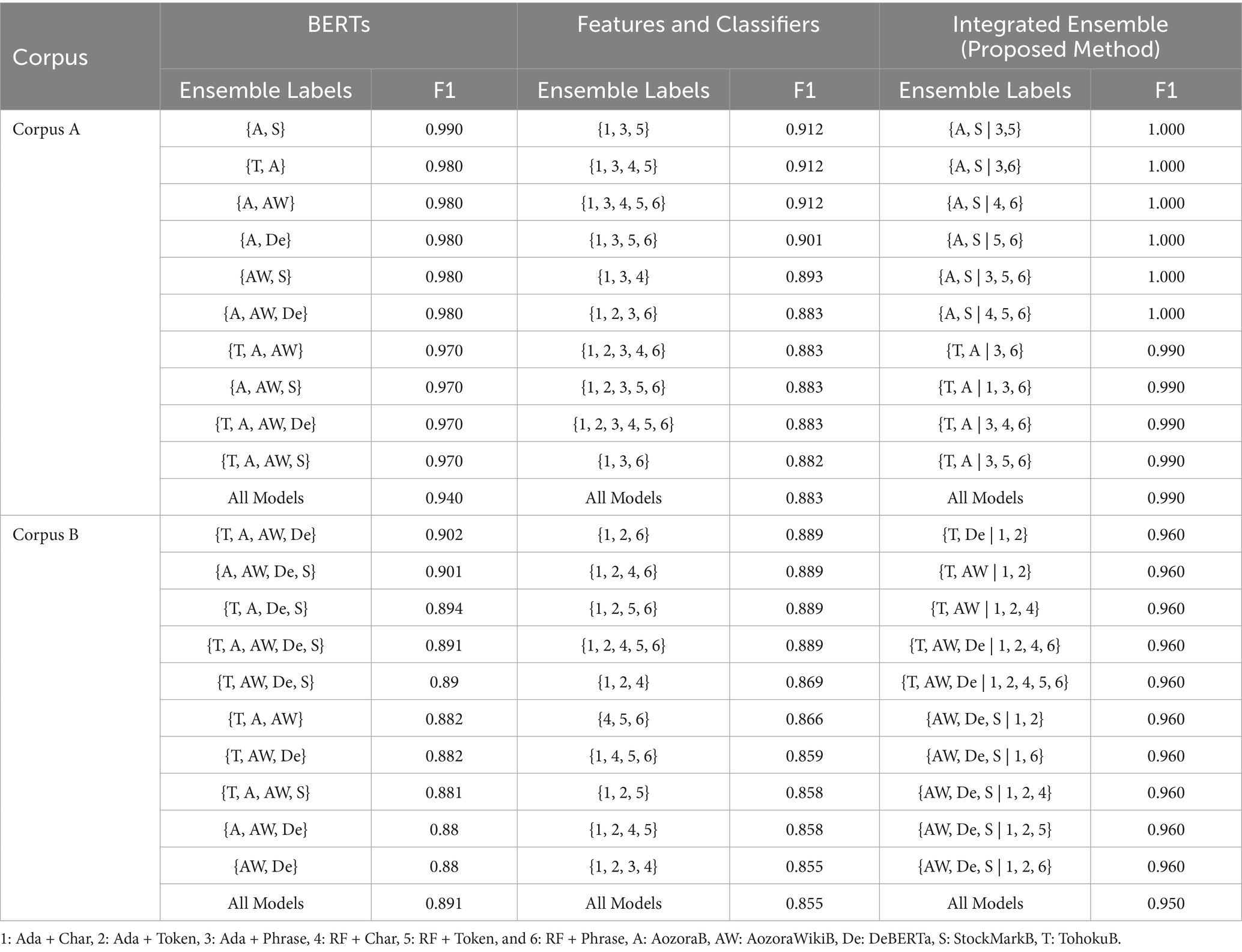 For Corpus A, Models A and AW were included in the pre-training data. Therefore, we considered excluding these two models from the integrated ensemble for Corpus A. The highest F1 score achieved by the ensemble excluding these models was 0.92, observed in the combinations {T, De 1, 3, 5, 6}, {T, S 1, 3, 5, 6}, and {De, S 1, 3, 5}. This score is 22.9 points and 11 points higher than the best scores of the standalone BERT models (0.691) and the feature-classifier combinations (0.810), respectively. Furthermore, it is 14.7 points higher than the best score (0.773) of the BERT ensemble {De, S} excluding Models A and AW, and 0.8 points higher than the best score (0.912) of the feature-classifier ensemble.