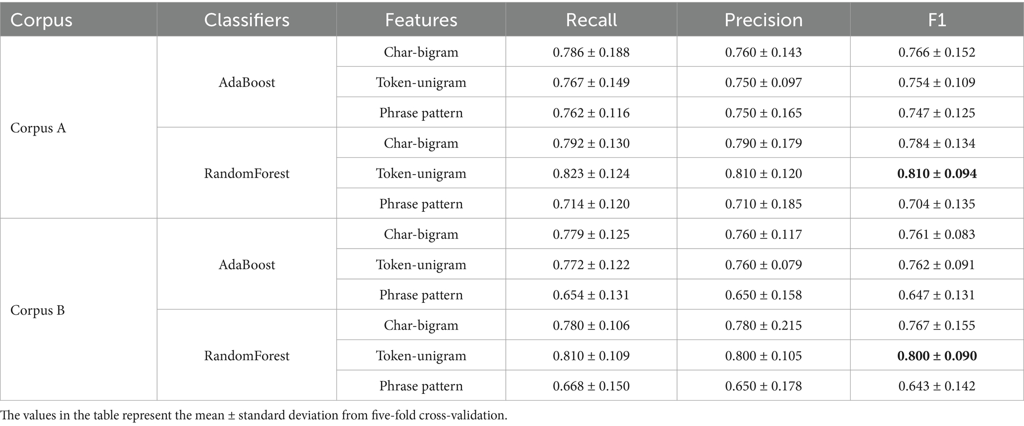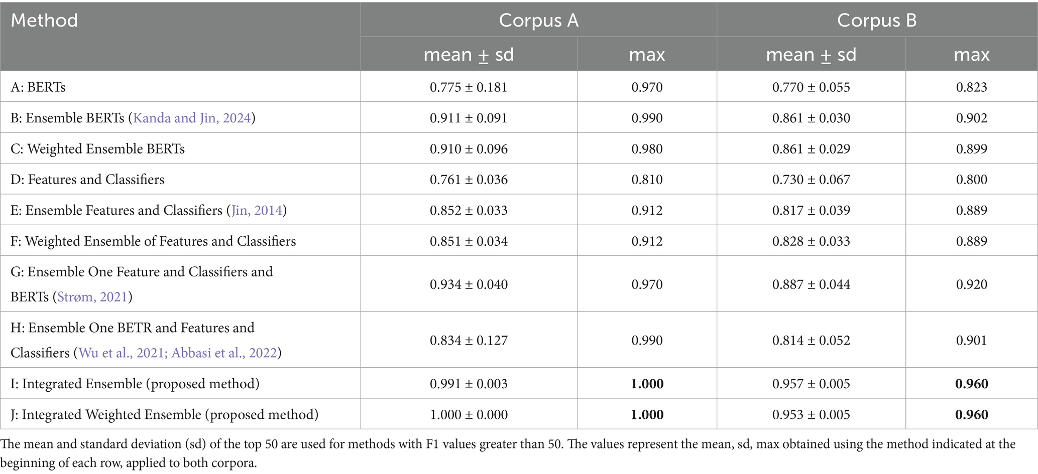 As shown in the last row of Table 5, the score for the integrated ensemble of all models was slightly lower than the highest score achieved by any individual ensemble. Nevertheless, it still represented a substantial improvement over the best-performing single model. Specifically, compared to the highest scores achieved by individual BERT and feature-based classifiers—both unaffected by ensemble effects—the score for Corpus B improved by 12.7 points. Our proposed method also outperformed the BERT model ensemble by 3 points and the feature-based ensemble by 6.1 points.