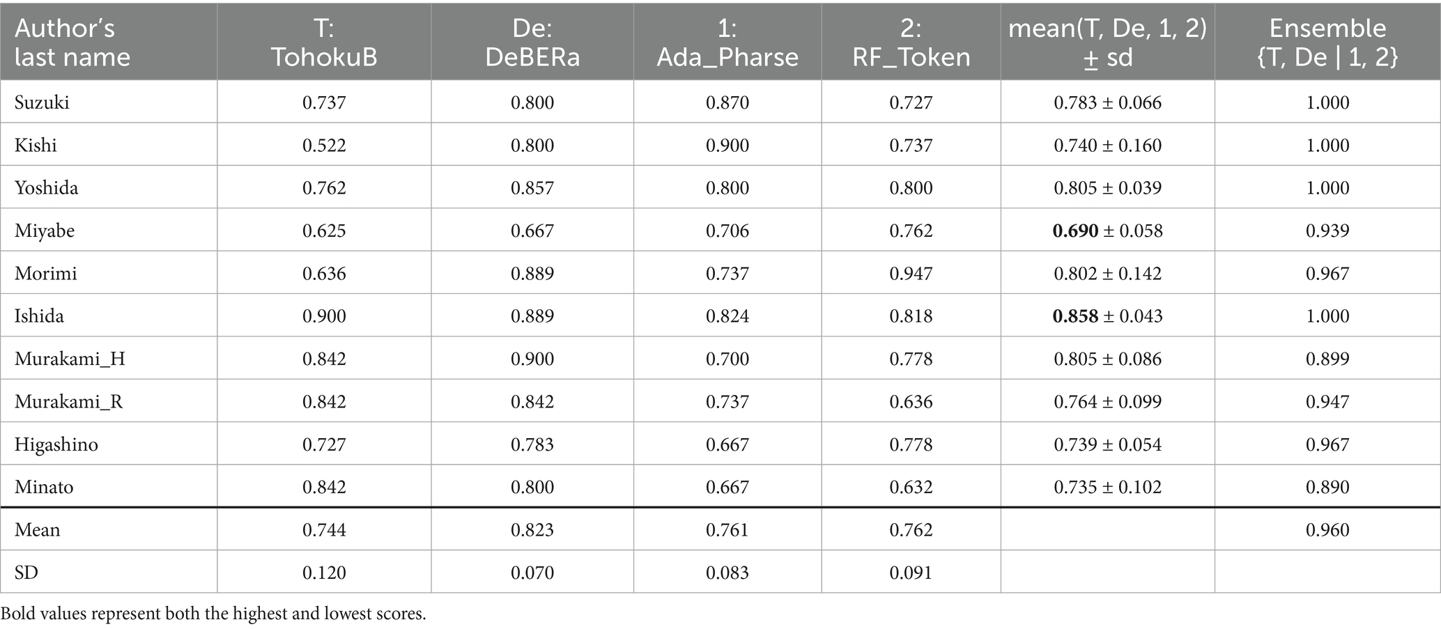 Citation: Kanda T, Jin M and Zaitsu W (2025) Integrated ensemble of BERT- and feature-based models for authorship attribution in Japanese literary works. Front. Artif. Intell. 8:1624900. doi: 10.3389/frai.2025.1624900