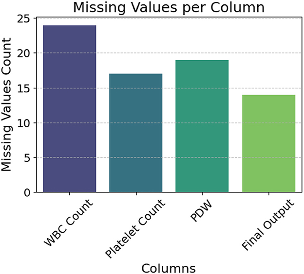 Figure 1 highlights missing entries in the WBC Count, Platelet Count, PDW, and Final Output columns. To address this, we applied a standard k-Nearest Neighbors (k-NN) imputation method for the clinical features. This approach was selected to preserve inter-feature relationships using local similarity in the patient data, and was implemented with default settings commonly used in biomedical preprocessing pipelines. Given our emphasis on building an end-to-end real-time system rather than fine-tuning individual preprocessing components, we prioritized stability and reproducibility over hyperparameter optimization.