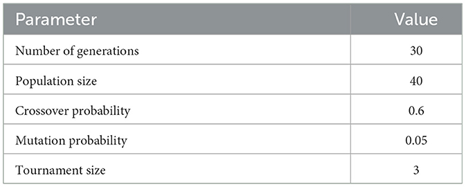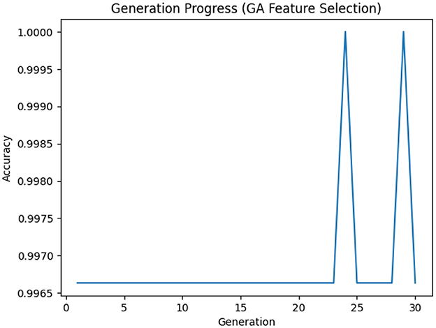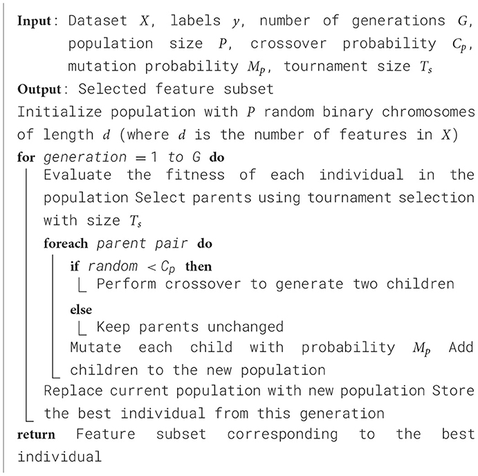 Feature selection was performed to improve efficiency and reduce computational time. This is done with the help of a Genetic Algorithm (GA) because GA can effectively choose and minimize overfitting on a set of relevant features (Siedlecki and Sklansky, 1989). GA's ability to explore various feature subsets makes it possible to select the most meaningful features for the model. Unlike traditional methods, GA can generate a better solution to feature subsets by converging to an optimal feature subset over generations (Absur et al., 2024).
