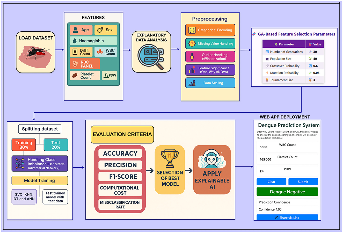 Keywords: dengue prediction, hematological features, explainable AI, genetic algorithm, data imbalance, decision trees, real-time inference, clinical decision support