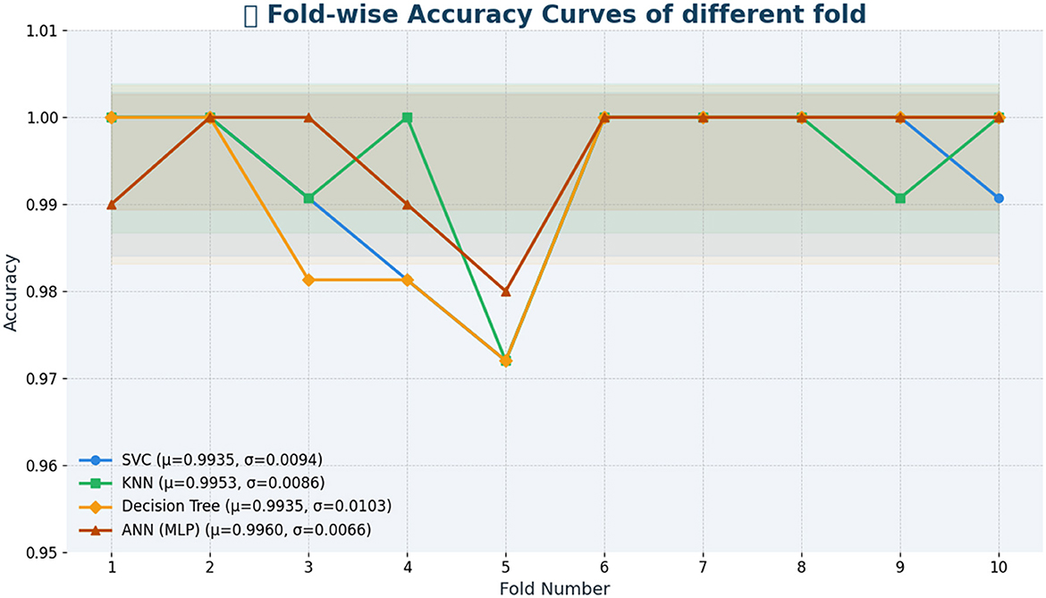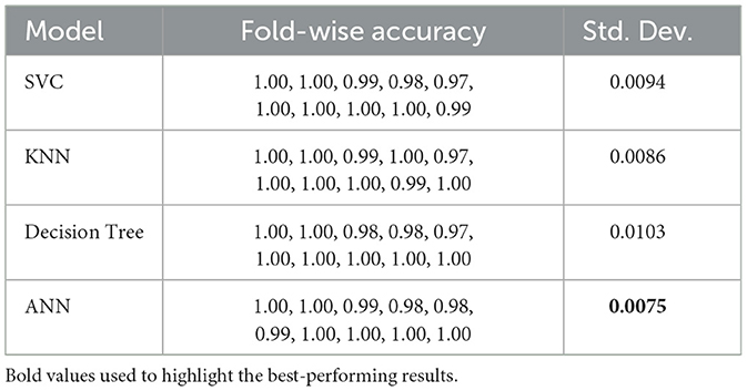 Table 11 shows fold-wise validation accuracies and standard deviations for each model. The SVC model yielded consistent results in each test fold, as its measurements consistently reached an accuracy of 0.99, although they fluctuated by 0.0094. In performing similarly to KNN, the model produced smaller variation outcomes (SD = 0.0086). Despite consistent performance in most splits, the Decision Tree model varies more than others, according to the 0.0103 standard deviation value. ANN demonstrates the most reliable results because its standard deviation stays at 0.0075 across all the data splits. The fold-by-fold learning curves provided in Figure 4 also support these findings with the general trends in training and validation performance across all the models indicating their stability when cross-validation was implemented.