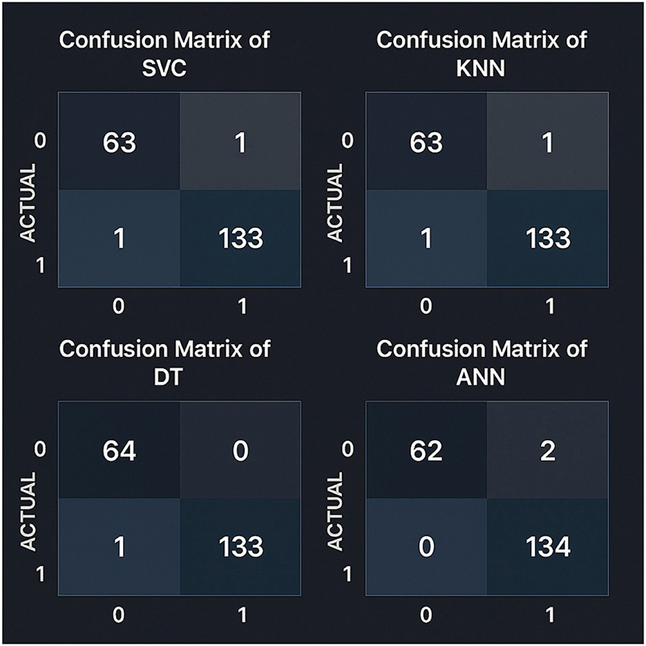 The Support Vector Classifier (SVC) and the KNearest Neighbors (KNN) models were identical, having 63 true negatives, one false positive, 133 true positives, and one false negative. In conrast, the Decision Tree model was slightly better by reducing false positives and achieving 64 true negatives, 133 true positives, and one false negative. Considering that the Artificial Neural Network (ANN) model had the best results among all the models in terms of detecting positives with 134 true positive and zero false negatives. However, it was slightly less accurate in detecting negative cases, with 62 correct and two wrong predictions. The analysis shows that the Decision Tree is a highly reliable model with only one misclassification.