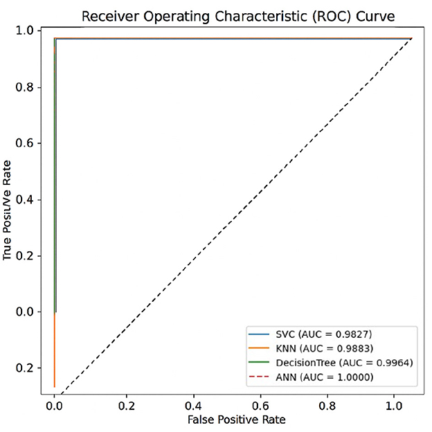 Moreover, as seen from Figure 6, the ROC curves show that the ANN model has a perfect AUC, which is more consistent with its ability to distinguish between positive and negative DENV cases. The ROC curves of the other models remain near the ideal levels, indicating excellent overall classification capabilities. These results are another validation of the robustness of the models evaluated, which would be directly applicable on the clinical level.