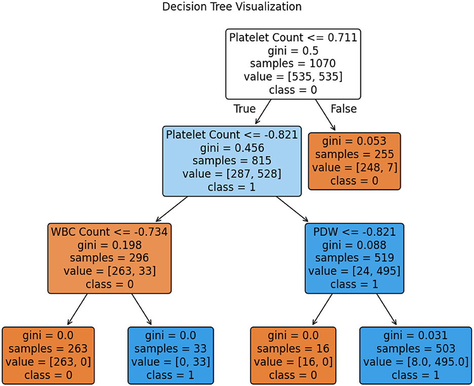 • Introduces an interpretable novel decision tree-based model for dengue risk prediction, incorporating clinical blood parameters such as platelet count, hemoglobin, and white blood cell count to improve the precision and robustness of the model.