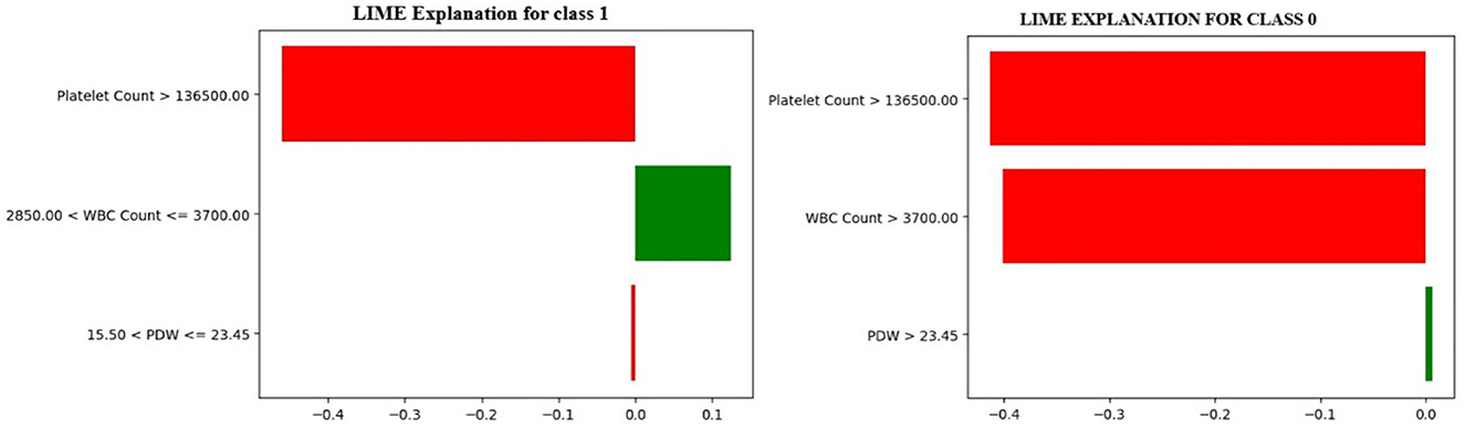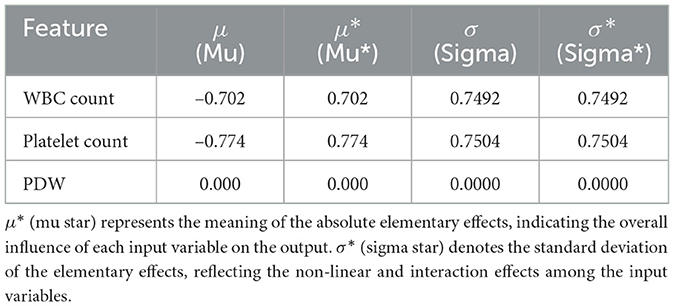 This triangulated framework was designed to capture: (i) robustness to perturbation (Morris), (ii) statistical dependency (Permutation), (iii) co-operative and local attribution (SHAP and LIME), and (iv) feature pruning logic (RFE). Discrepancies, such as the differing rankings of PDW across methods, were analyzed as informative divergences reflecting methodological contrasts—not inconsistencies. For brevity, SHAP and LIME are emphasized in the main discussion due to their clinical interpretability. Also, Morris sensitivity analysis and permutation importance both assess individual feature impact on model output—Morris by introducing small changes, and permutation by shuffling values and measuring performance drop. In this study, PDW was selected by the Genetic Algorithm (GA) as important, yet both Morris and permutation methods assigned it zero importance. This discrepancy arises because GA evaluates feature combinations, while Morris and permutation assess features individually. Thus, PDW may not be impactful alone but contributes through interactions.