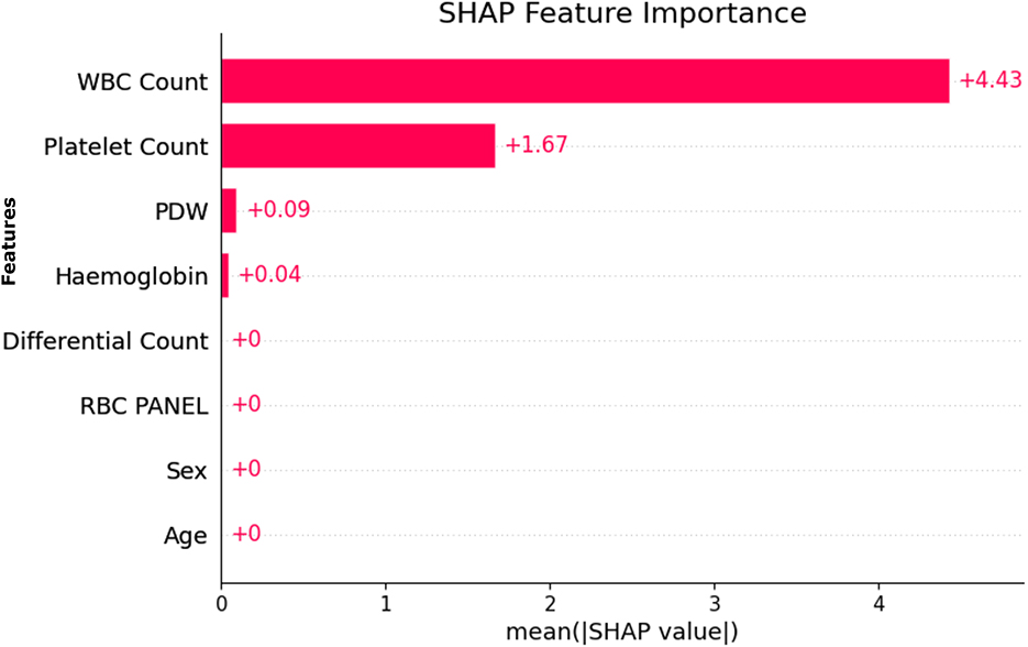 • SHAP and RFE are used to discuss the transferability and ubiquity of selected hematological characteristics—WBC count, platelet count, and PDW—to show that they are consistently highly predictive and could be applied to other datasets as well.