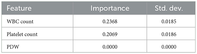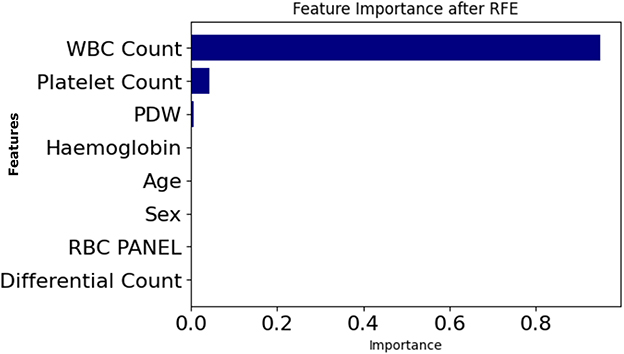 • Recursive feature elimination (RFE) selected a minimal, high-performing subset including PDW, WBC Count, and RDW, aiding model simplification and informing feature engineering.