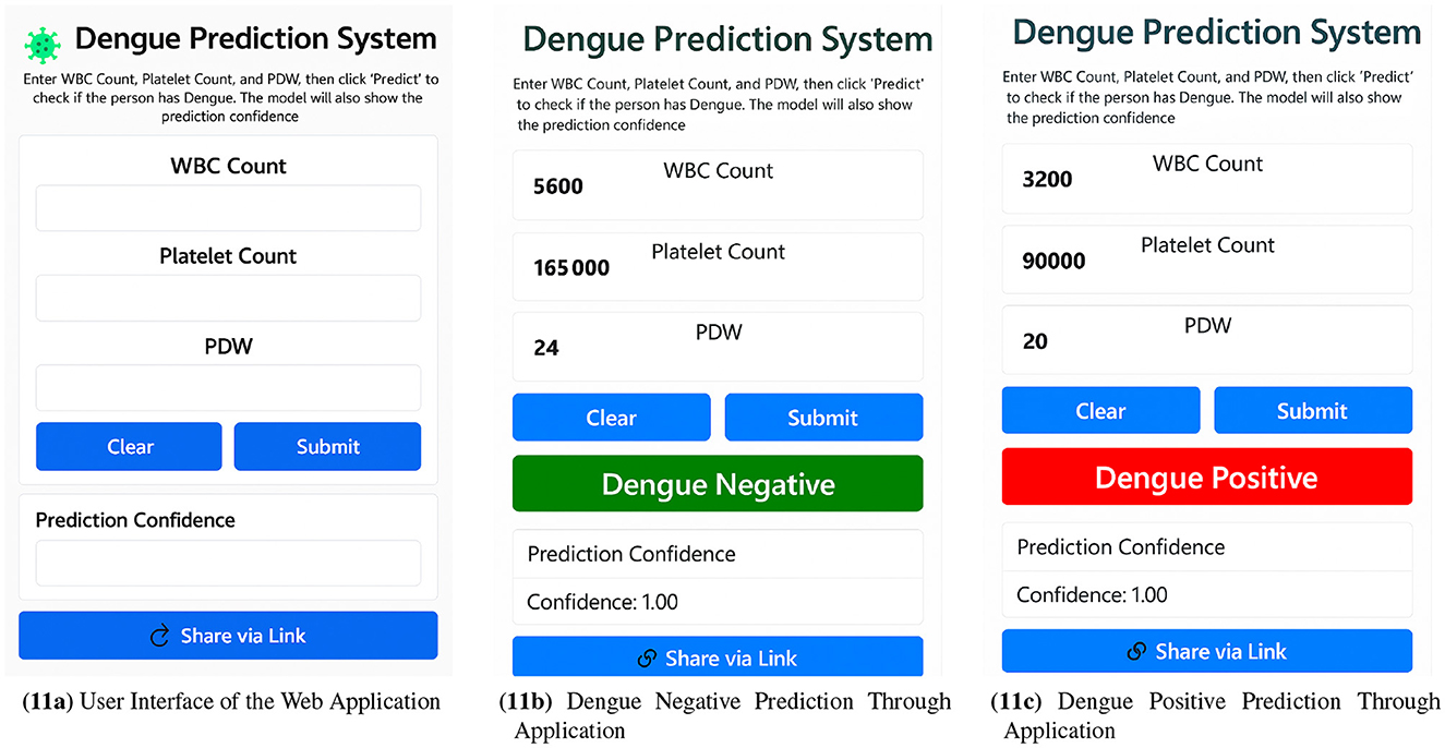 Figure 11. Web application workflow showcasing (a) user interface, (b) dengue negative prediction, and (c) dengue positive prediction via the web application.