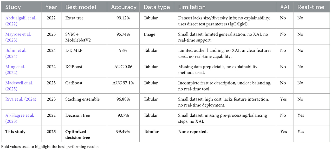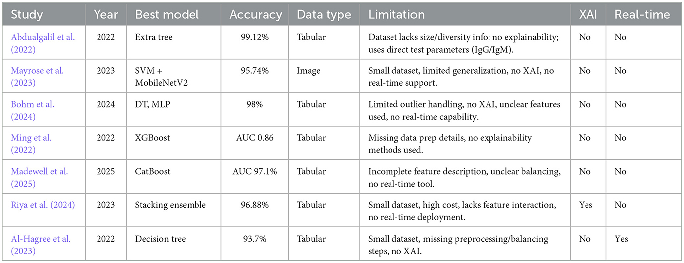 This section reviews the limitations of machine learning approaches and diagnostic techniques used for detecting dengue based on the existing literature and the limitations of the studies. Table 1 summarizes the key aspects of previous works, including their achieved accuracy, noted limitations, and the presence of XAI integration or web-based deployment.