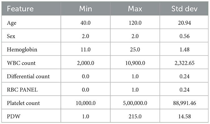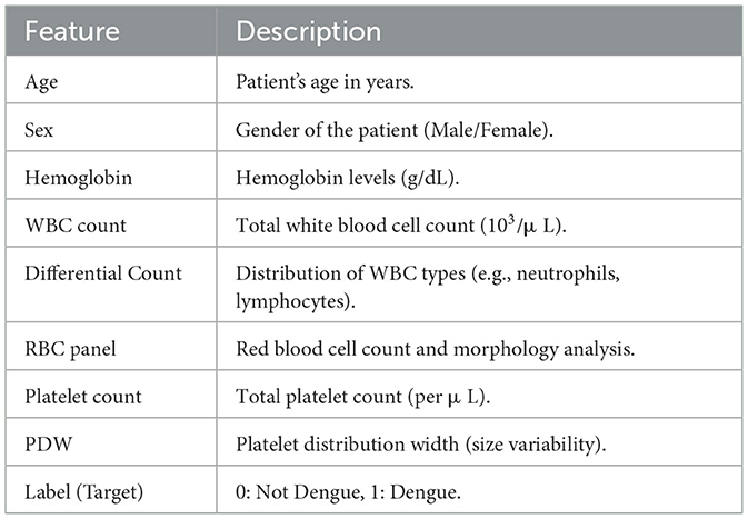 This study used a dataset from Mendeley Data (Mim et al., 2024; Assaduzzaman et al., 2024). It contains clinical blood parameters for Dengue fever. It had eight features in total. There were two demographic features, six clinical parameters, and one target class. Predicting and diagnosing Dengue fever is dependent on these features. The dataset includes 1,003 records (669 dengue-positive, 320 non-dengue) from patients at Upazila Health Complex, Kalai, Jaipurhat, Bangladesh. Clinical verification was ensured through healthcare professional involvement (Assaduzzaman et al., 2024). Order dependency has been addressed to eradicate bias from the data (Ahmed Nasif et al., 2019). The Table 2 describes each feature in the dataset.