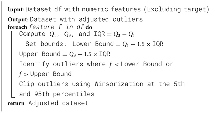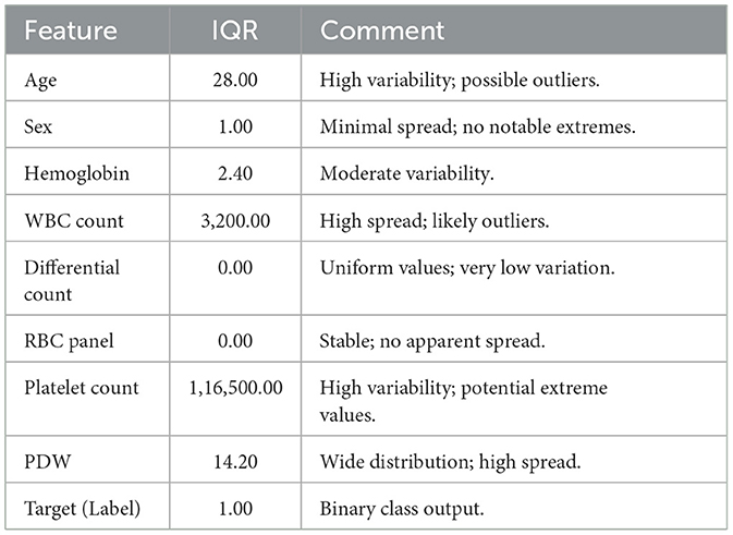 IQR is calculated to identify which features have the most extreme values, as shown in Table 3 (Dash et al., 2023). It reveals that Age, WBC Count, PDW, and Platelet Count have the most extreme values. Consequently, outliers are identified using the interquartile range (IQR), and adjustments are made through Winsorization capping to mitigate the impact of these outliers on the model (Blaine, 2018). Algorithm 1 provides the outlier detection and removal process.