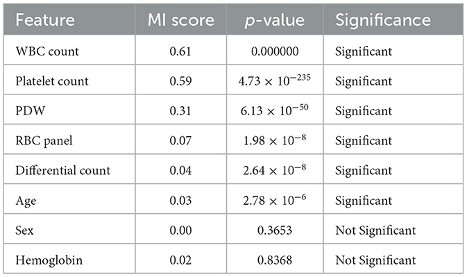 Mutual information scores and one-way ANOVA were computed to identify the most significant features for predicting Dengue fever (Kim, 2017). A 95% confidence level ANOVA test was conducted at a 0.05 significance value threshold for p values.Sex and Hemoglobin were found to have mutual information scores of 0.0 and 0.017, respectively, with corresponding p-values of 0.3653 and 0.8368. These results indicate that Sex and Hemoglobin do not contribute significantly to the prediction of Dengue fever. The Table 4 shows mutual information scores and p-values for all features, along with their significance status.