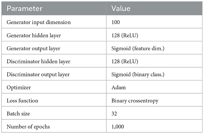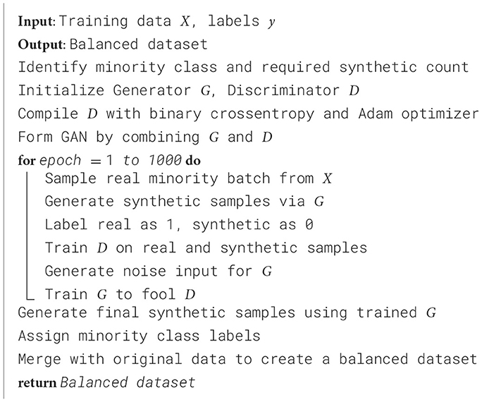 Table 7 shows that the training set is highly imbalanced, and hence, the model predictions will be biased, and the generalization performance will degrade. To resolve this issue, a Generative Adversarial Network (GAN) is used to generate realistic synthetic samples of the minority class, resulting in 535 samples for each class in the distribution (Mariani et al., 2018). In comparison, methods like SMOTE or ADASYN might still be unable to represent the complex data patterns; hence, GAN preserves the underlying structure in the data.