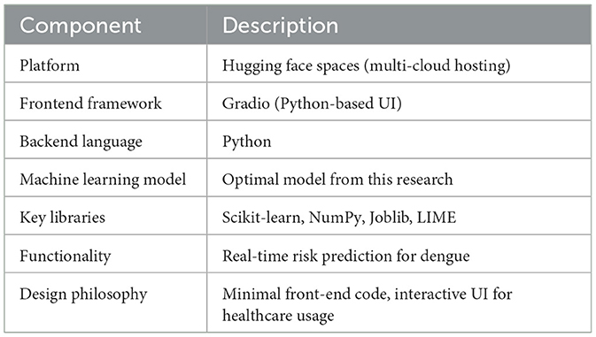 A web-based application was developed using the optimal model from this research to provide real-time dengue risk assessment. The interface simulates a healthcare professional's input system and offers instant prediction by accepting key medical parameters. Built using Python and Gradio, the application ensures fast deployment, ease of use, and seamless model integration. It is hosted on Hugging Face Spaces for accessible, scalable deployment. Key implementation details—including frontend framework, backend libraries, and model integration tools—are summarized in Table 9.
