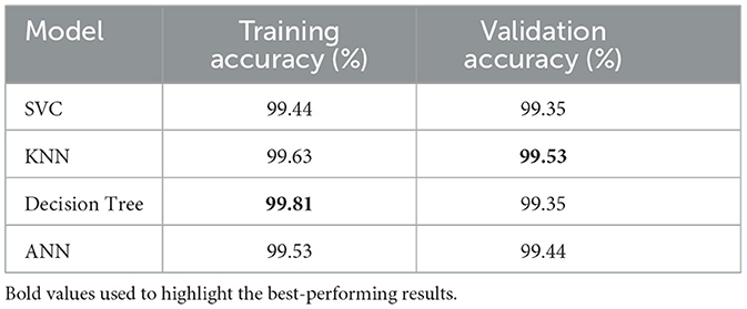 Table 10 presents training and validation accuracies of various machine learning models used to predict dengue. The SVC model's training accuracy reached 99.44%, and its validation accuracy was 99.35%. Regarding generalization, the KNN model achieved the highest validation accuracy of 99.53%, with a training accuracy of 99.63%. The model with the highest training accuracy was the Decision Tree, with a score of 99.81%. However, its validation accuracy was 99.35%. The ANN model also had the same consistent results, as its training accuracy was 99.53% and validation accuracy was 99.44%.