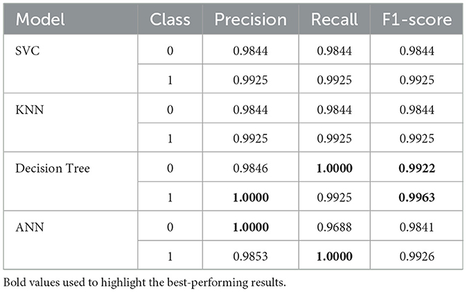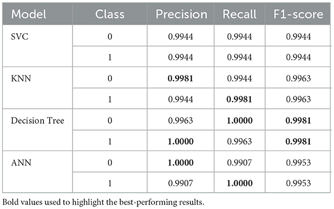 Finally, the SVC model optimizes performance with a precision and recall of 0.9944 for both classes, resulting in an F1-score of 0.9944. In terms of precision, the KNN model achieves a score of 0.9981 for class 0 and a recall score of 0.9981 for class 1, resulting in an F1 score of 0.9963 in both classes. Looking at the Decision Tree we can see substantial precision (1.0000) for class 1 as well as a good F1-score of 0.9981. In class 0 (1.0000) the ANN model is perfect in precision, for class 1 (0.9907) the recall is strong (0.9953) and the F1 is 0.9953.