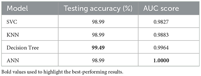 The testing accuracy and AUC values of the evaluated models are depicted in Table 13. An identical testing accuracy of 98.99% was achieved by the Support Vector Classifier (SVC), K-Nearest Neighbors (KNN), and Artificial Neural Network (ANN), suggesting high precision of diagnosing between dengue and non-dengue cases. Although these three models have a uniform accuracy, there is variation in AUC. For example, the ANN achieved a perfect AUC of 1.00, indicating that it perfectly distinguishes between dengue and non-dengue cases. On the other hand, SVC and KNN produce slightly lower AUCs, about 0.9827 and 0,9883, respectively.