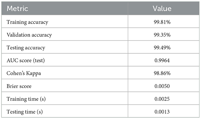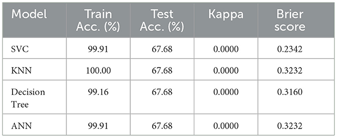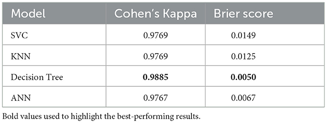 To ensure the reliability of the models beyond accuracy, Cohen's Kappa and Brier Score metrics are used as presented in Table 15. The accuracy of the probabilistic predictions is evaluated by the Brier Score, and a lower value indicates a better-calibrated model. At the same time, the Kappa score measures how close predicted and actual labels are to agreement, taking chance agreement into account (McHugh, 2012; Bradley et al., 2008; Viera and Garrett, 2005). Likewise, other models such as SVC, KNN, and ANN had very high Kappa values (≥0.9767), though with considerably higher Brier Score which implies a bit less confidence in prediction. These results confirm that the optimized Decision Tree model performs best in terms of reliability and consistency of prediction and can be used to make reliable and trustworthy Dengue detections.