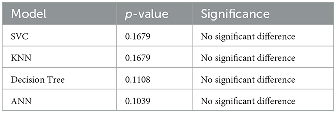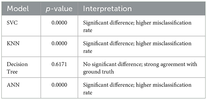 First, statistical robustness was assessed through McNemar's test and paired t-tests. The DT model is the only one whose predictions are statistically indistinguishable from ground truth (p = 0.6171), while ANN, SVC, and KNN each show significant divergence (p < 0.001), as summarized in Table 17 (McNemar's Test Results). Paired t-tests against a perfect baseline (Table 18: Paired t-test vs. Theoretical Accuracy) indicate no considerable performance gap across all models, with DT (p = 0.1108) and ANN (p = 0.1039) well above the rejection threshold. This supports our claim that performance parity exists and that more complex models do not guarantee statistically superior generalization under our dataset.