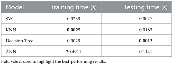In addition to testing accuracy and AUC, Table 14 shows the precision and F1 Score of the models. These metrics provide a deeper insight into overall performance, facilitating a more detailed evaluation of the models' effectiveness. To begin with, it is observed that the Decision Tree model stands out with perfect recall for class 0 and the highest F1 Score for class 1, highlighting its exceptional ability to identify both dengue and non-dengue cases. In contrast, the ANN demonstrates excellent precision for class 0 but exhibits a slight dip in recall. However, both SVC and KNN show stable performance, maintaining a balanced precision and recall, although their F1-scores are slightly lower than those of the Decision Tree.