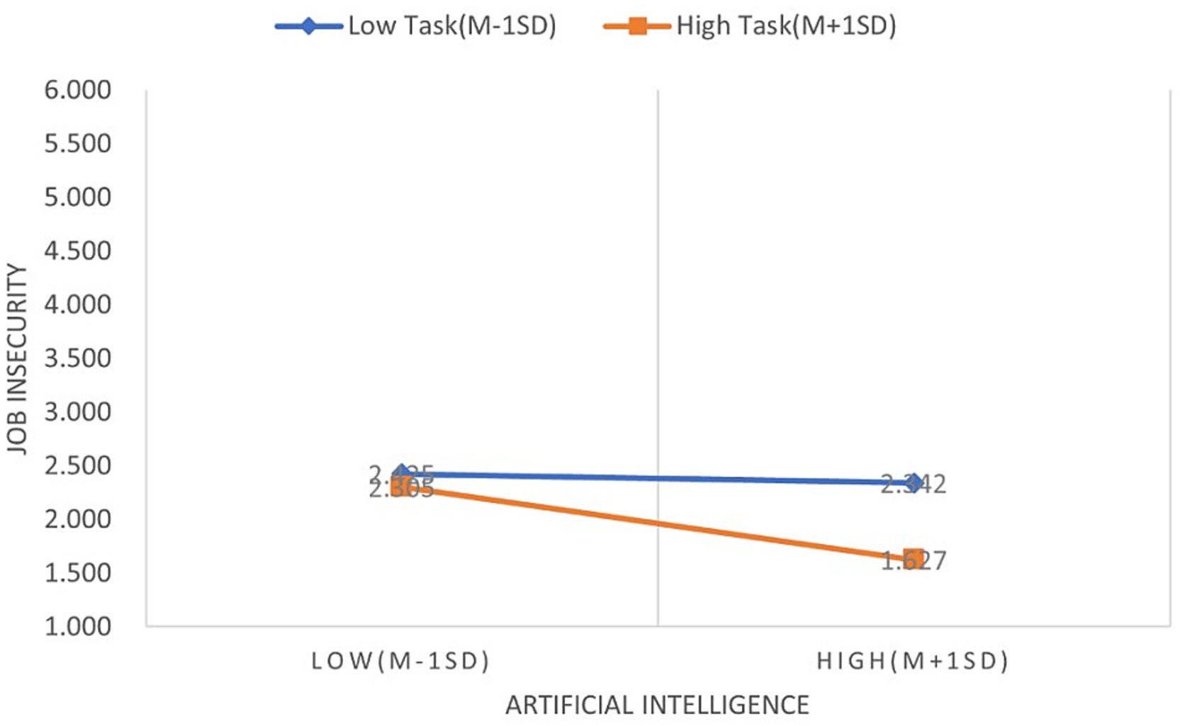 According to this study, the loss pathway of AI technology adoption to job insecurity will be weakened by task crafting. First of all, when workers feel in charge of their work, job instability can be decreased, which encourages creative behavior (Zhu et al., 2021). Task crafting turns workers from passive consumers of technology into active designers of their work by giving them the freedom to proactively modify job boundaries and procedures. The primary source of perceived control is this sense of direct intervention in work processes, which lays the psychological groundwork for later reducing emotions of insecurity. Strong task crafting skills enable workers to collaborate with AI technology and function as "captains" of their work, keeping them competitive with intelligent robots and lowering job insecurity and replacement anxiety (Wang et al., 2019). Secondly, people with a high degree of task crafting actively modify and adapt current tasks, completing established work in a flexible and independent manner rather than strictly following outdated guidelines. This enables workers to discover work methods that work better for them and more successfully adjust to changing demands and environments (Wang and Yao, 2022; Ma et al., 2022). On the other hand, people with low task crafting skills rely too much on pre-existing tasks because they think that fulfilling fundamental work requirements and avoiding errors and risks are more important. This leads to a mismatch between their needs and the challenges and learning that come with using AI technology (Zhang et al., 2023). Employee work practices and the organization's AI-optimized requirements are significantly out of sync when task crafting is low. Employees who experience this adaptation lag become painfully aware of the widening gap between their own abilities and job needs, which directly translates "rigid work patterns" into uncertainty about their ongoing usefulness and, eventually, creates the feeling of unemployment risk: "Will technology take my place?" Employees perceive a higher danger of technical unemployment as a result of this sluggish work style, which heightens job insecurity. Thus, we hypothesize: