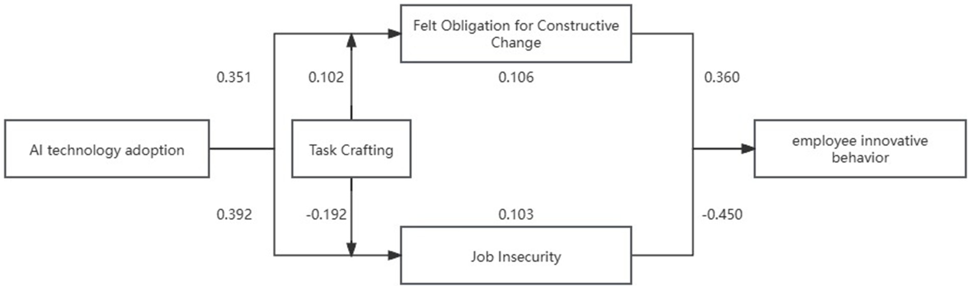 Results: (1) AI technology adoption is a job resource that increases Felt Obligation for Constructive Change (FOCC), but it also acts as a job demand that inhibits innovation by creating a sense of job insecurity; (2) task crafting is a crucial boundary condition that amplifies the positive mediation path while attenuating the negative pathway.
