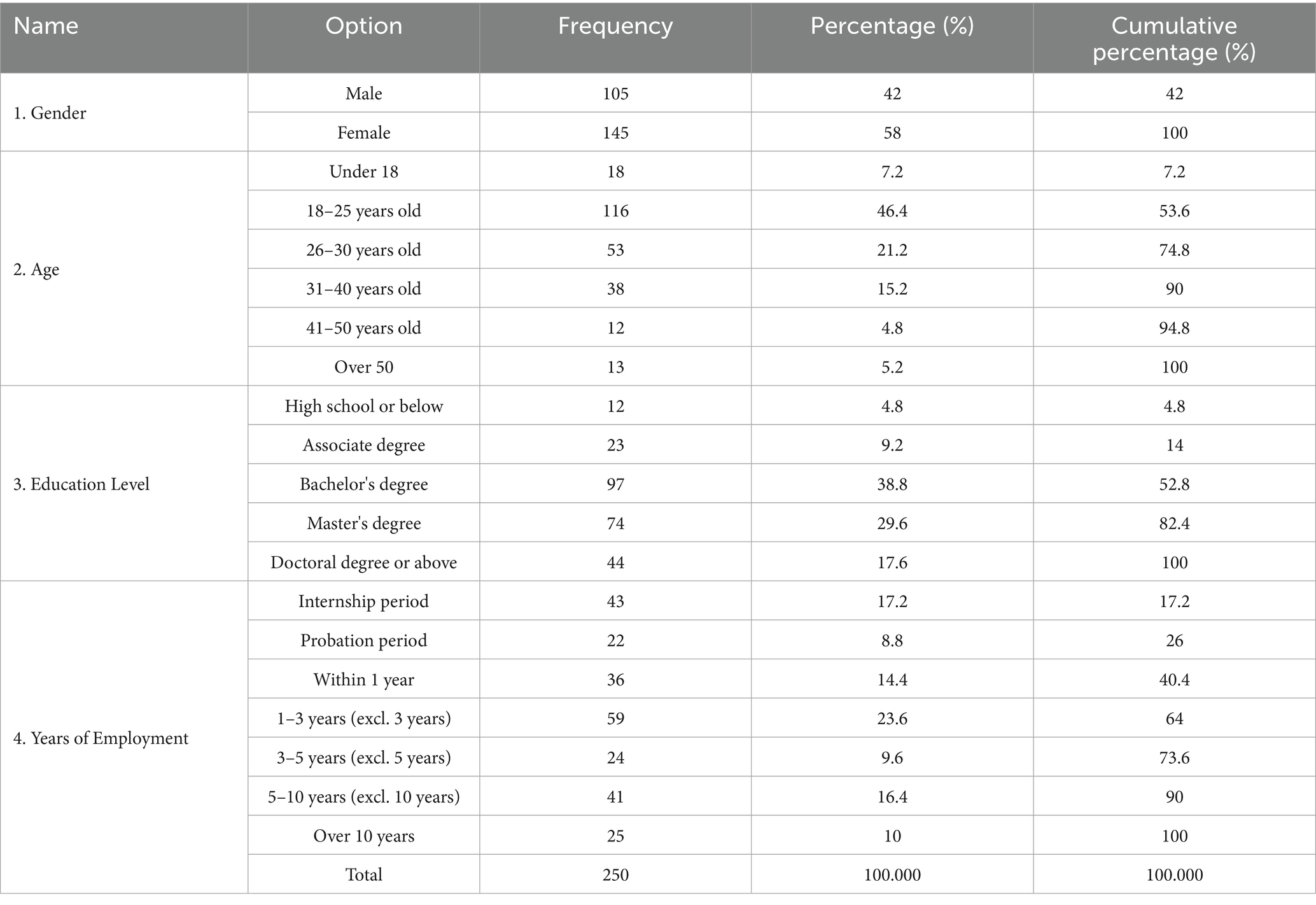 In accordance with accepted methodological antecedents, the survey questionnaire included operational definitions of workplace AI technology adoption to guarantee ecological validity. To improve response fidelity, participants were given digital red envelopes with randomized cash incentives (CNY 1-2) after finishing the survey. Questionnaires having a response time of less than 30 s, duplicate responses, and illogical reasoning were eliminated after data filtering. With an efficient recovery rate of 89.93%, 250 valid questionnaires out of the 278 that were initially issued were ultimately kept. The final sample included 42% male and 58% female participants (M-age = 27.96 years), with 46.4% of participants being between the ages of 18 and 25, as shown in Table 1. 33.2% of employees had 1–5 years of organizational experience, according to a workforce tenure analysis (M-tenure = 3.88 years). Table 1 give complete demographic distributions in a systematic manner.