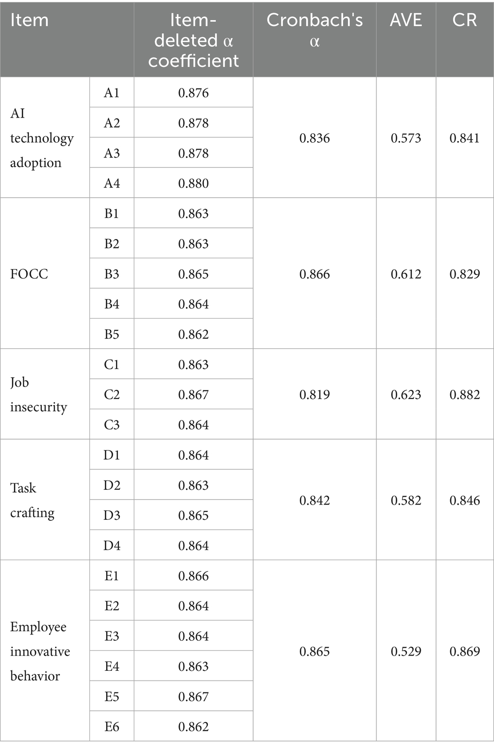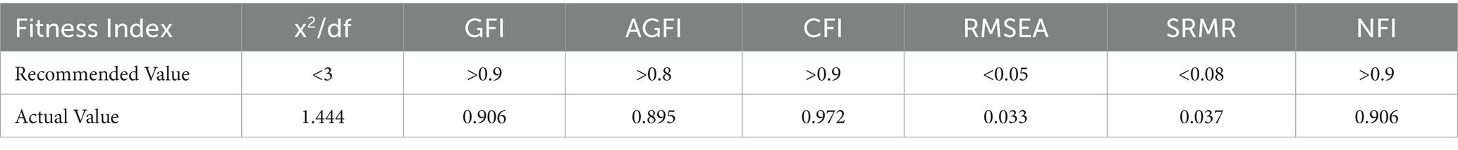 According to Table 2, the four dimensions of AI technology adoption, FOCC, job insecurity, and employee inventive behavior all match psychometric norms for internal consistency (Cronbach's α > 0.80) and composite reliability (CR > 0.80). Meanwhile, this study used AMOS 24.0 software to test the overall fitness of variables. According to the calculation results of fitness parameters shown in Table 3: x2/df = 1.444 < 3, GFI = 0.906 > 0.9, AGFI = 0.895 > 0.8, CFI = 0.9720.9, RMSEA = 0.033 < 0.05, SRMR = 0.037 < 0.08, NFI = 0.906 > 0.9. All indicators met the fitness criteria, indicating that the discriminant validity was established. Convergent validity is also confirmed by AVE values that exceed the 0.50 threshold for all constructs. Significant item intercorrelations (KMO = 0.88, p < 0.05) in the factor analysis show methodological rigor and validate the structural validity of the measurement model.