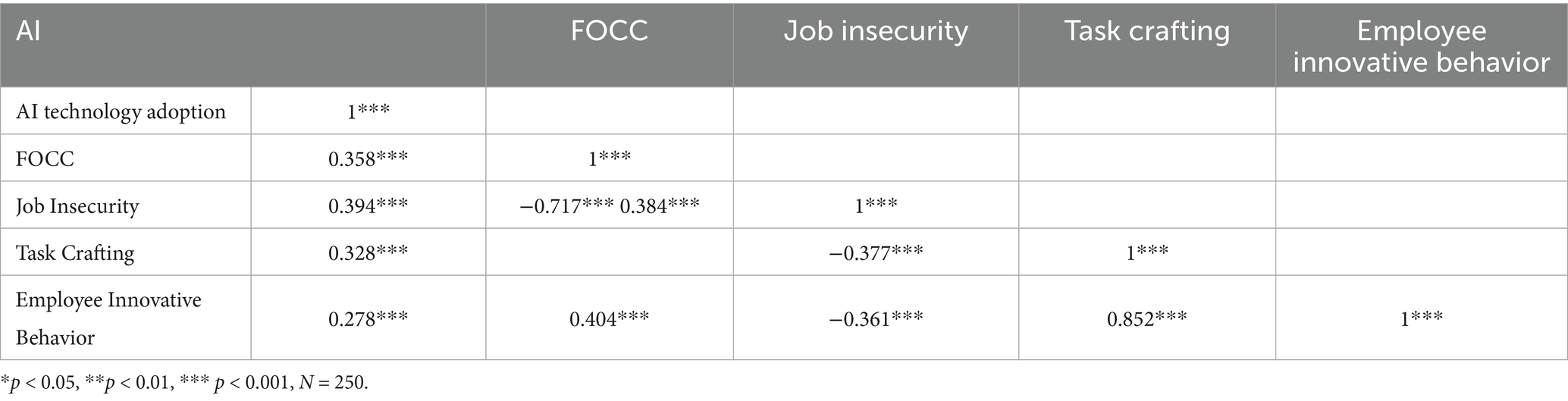 Western measurement tools with proven validity and reliability were used in this study. 5-point Likert scales with 1 denoting "strongly disagree" and 5 denoting "strongly agree" were used to measure each construct. In particular, Man Tang et al.'s (Man Tang et al., 2022) scale evaluating employee-AI interaction dynamics was used to evaluate AI technology adoption. A sample statement reads "My organization has implemented substantial AI technologies and equipment that influence multiple work dimensions, including reasoning, decision-making, and problem-solving processes" (α = 0.87). FOCC was operationalized through Eisenberger et al.'s (Eisenberger et al., 2001) scale, reflecting employees' felt duty to assist organizational improvement through positive changes. Representative items include "I consider it my obligation to contribute to organizational change and development" (α = 0.94). The Mauno et al.'s (2001) item "I worry about being compelled to resign before voluntarily leaving my position" (α = 0.73) was used to measure job insecurity. The task crafting sub dimension of Bindl et al.’s (2019) job crafting scale served as the basis for the task crafting evaluation. "I regularly incorporate preferred elements into my work responsibilities" (α = 0.90) is a characteristic item. The Zhang et al.'s (2016) measure measuring willingness to apply creative job adjustments was used to assess innovative behavior among employees. "I frequently experiment with novel approaches to resolve workplace challenges" (α = 0.844) is one example item.