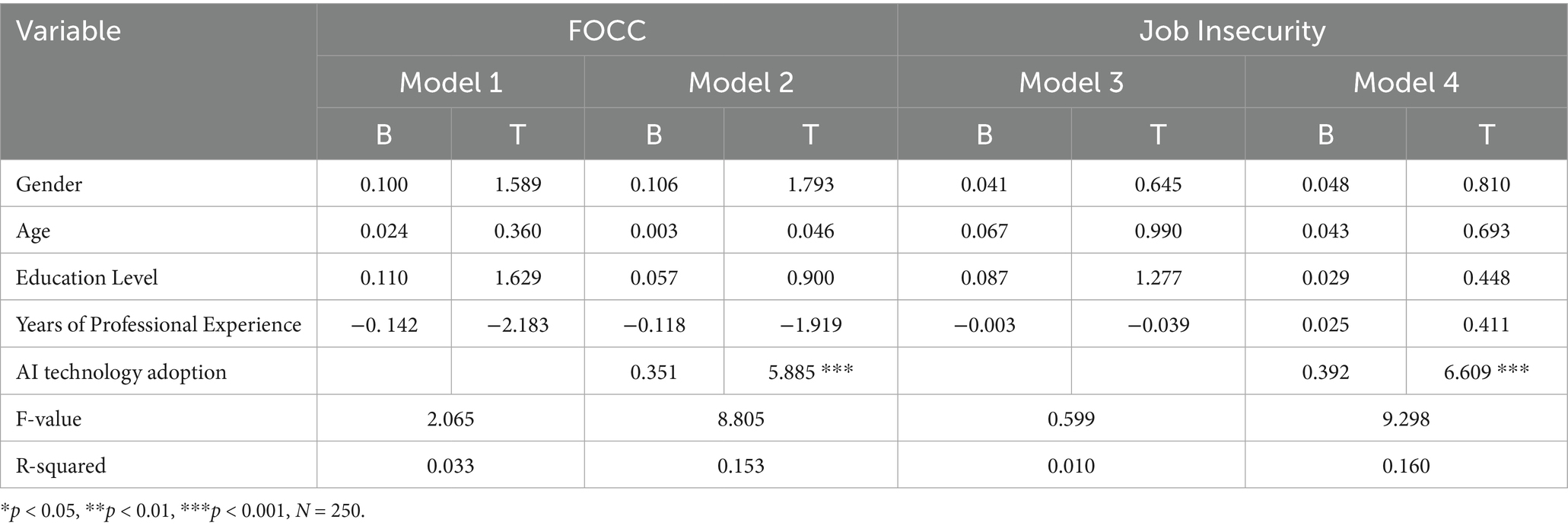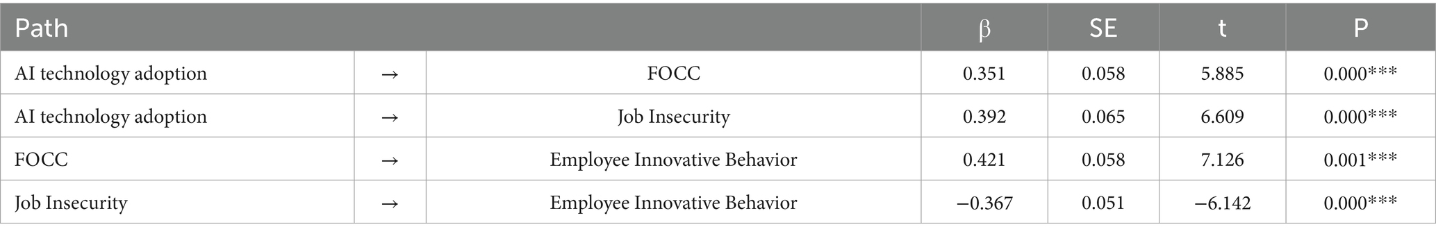 The results of the hypothesis testing were methodically recorded in Tables 5 and 6, and SPSS 27.0 was used for statistical analysis in this study. H1 is confirmed by the analytical results, which show a substantial positive connection between AI technology adoption and FOCC (β = 0.351, p < 0.001). At the same time, there is a significant positive link between the use of AI technology and job insecurity (β = 0.392, p < 0.001), which empirically supports H2. Notably, employment instability exhibits a substantial negative correlation with inventive activity (β = −0.367, p < 0.001), but FOCC positively predicts such conduct (β = 0.421, p < 0.001). Key status factors (gender, age, and occupational tenure) were analytically divided using covariance stratification, adhering to quasi-experimental design norms, in order to separate the AI-perception variance that may be attributed to techno-psychological mechanisms from false demographic covariance.