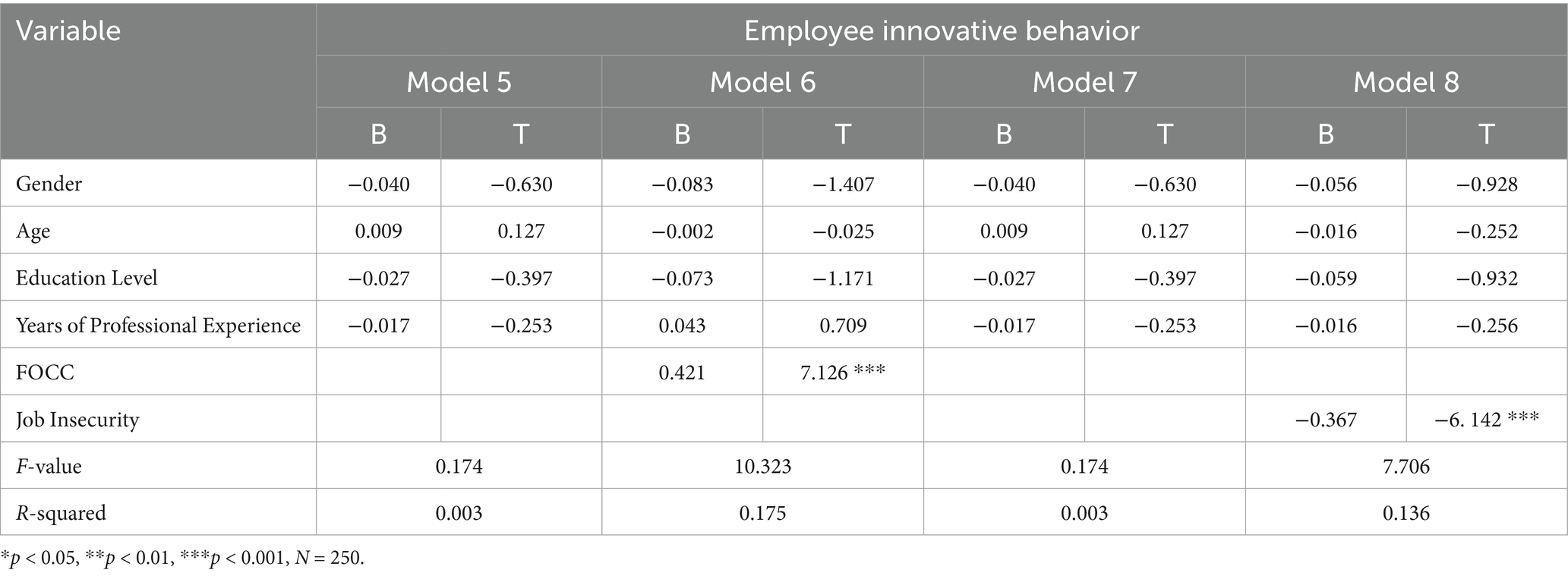 This study uses SPSS 27.0 to do correlation analysis, and the correlation analysis findings are shown in Table 4. It is evident that AI has a strong positive correlation with both FOCC (r = 0.358, p < 0.001) and job insecurity (r = 0.394, p < 0.001). Furthermore, in line with the theoretical hypotheses, there is a significant negative correlation (r = −0.361, p < 0.001) between job insecurity and employee innovative behavior, and a significant positive correlation (r = 0.404, p < 0.001) between FOCC and innovative behavior.