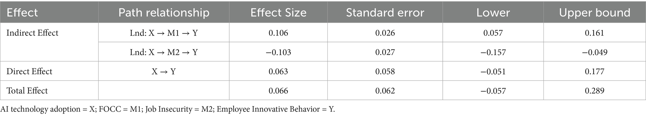 The effect size of "AI Technology adoption → FOCC → Employee Innovative Behavior" in the job resources route is 0.106, with a 95% CI of [0.057, 0. 161], as indicated in Table 7. This suggests that AI technology has a large favorable impact on employee inventive behavior through FOCC, supporting H3. The effect size of "AI Technology Application → Job Insecurity → Employee Innovative Behavior" in the job demands route is −0.103, with a 95% confidence interval of [−0.157, −0.049]. This suggests that AI technology has a considerable detrimental impact on employee inventive behavior through job insecurity, supporting H4.