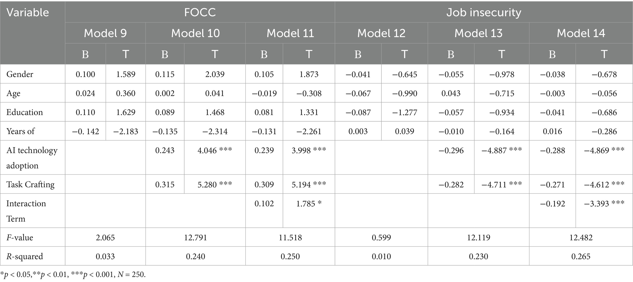 H5 is confirmed by the interaction effect between task crafting and AI technology adoption, which shows a substantial positive influence on FOCC (β = 0.102, p < 0.1), as shown in Table 8. H7 is empirically supported by this interaction term, which shows a statistically significant negative correlation with job insecurity (β = −0.192, p < 0.001). Simple slope analyses were performed to visually represent the moderating function of task creation, and the findings are shown in Figures 2, 3. In particular, Figure 2 shows that the positive correlation between the use of AI technology and FOCC is stronger when task crafting is high as opposed to low. Similarly, when task crafting is increased, Figure 3 shows a larger negative correlation between AI adoption and job insecurity.