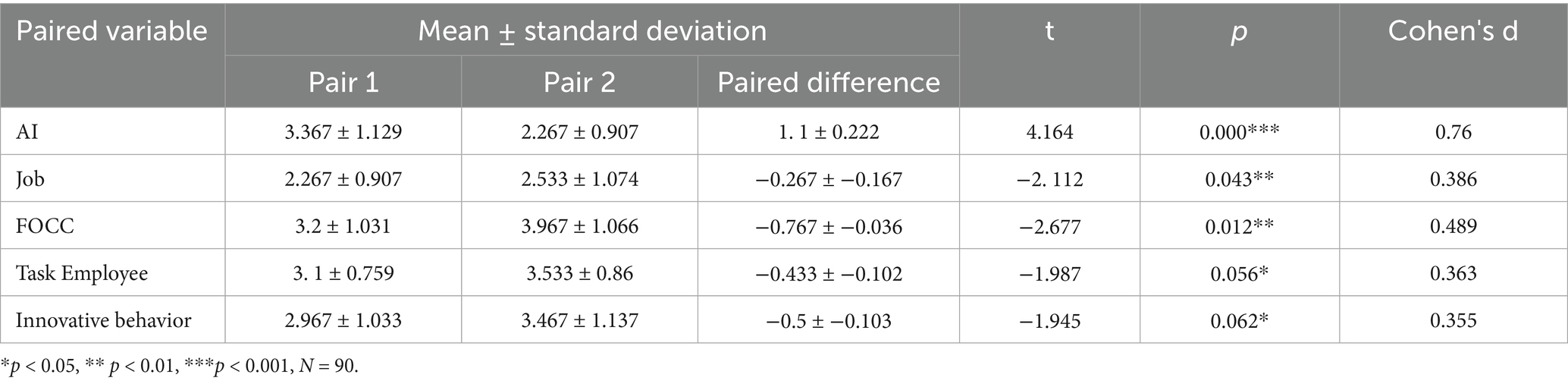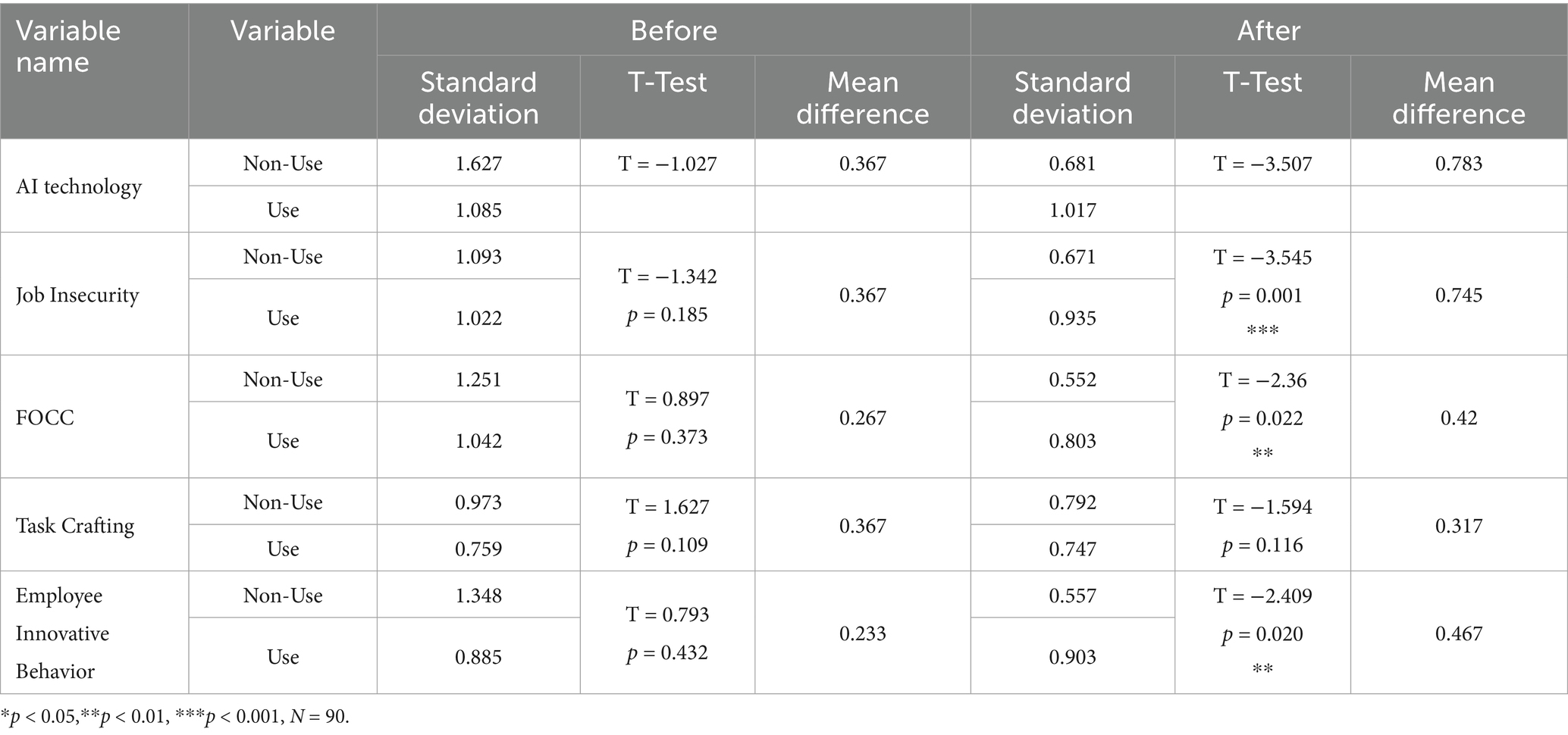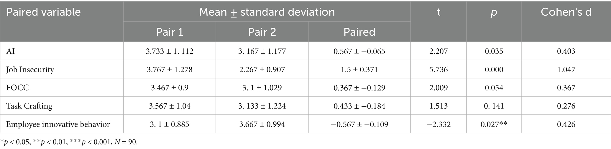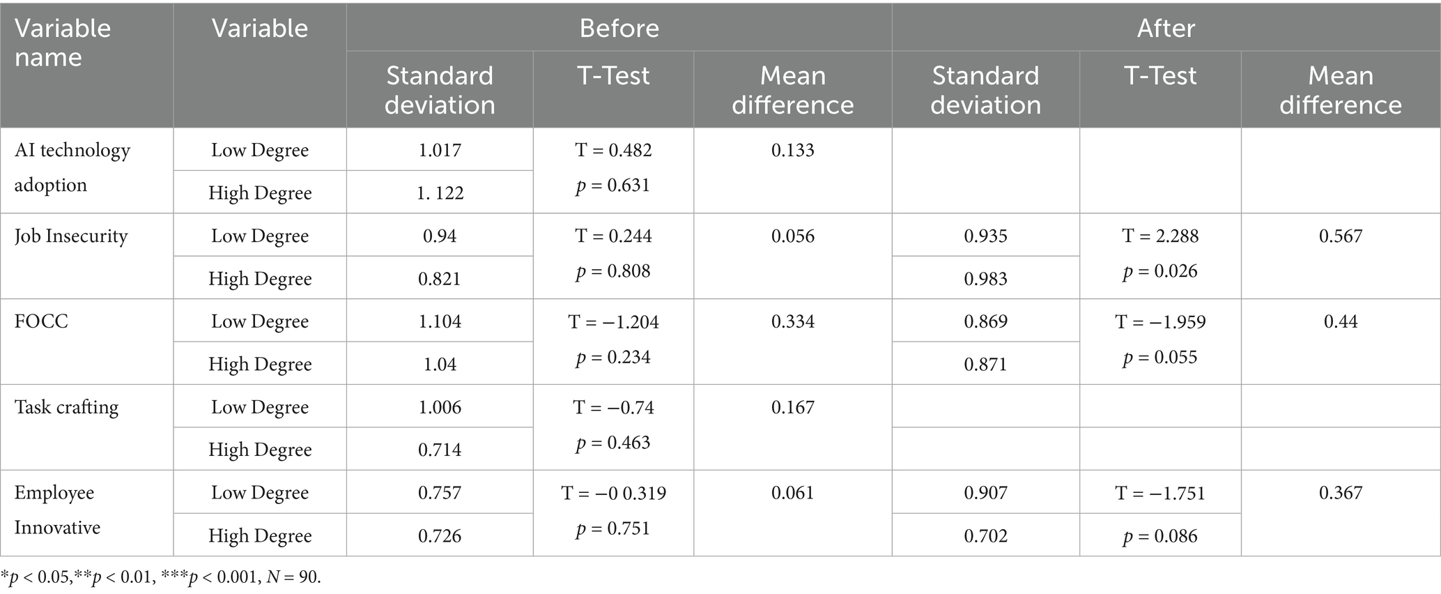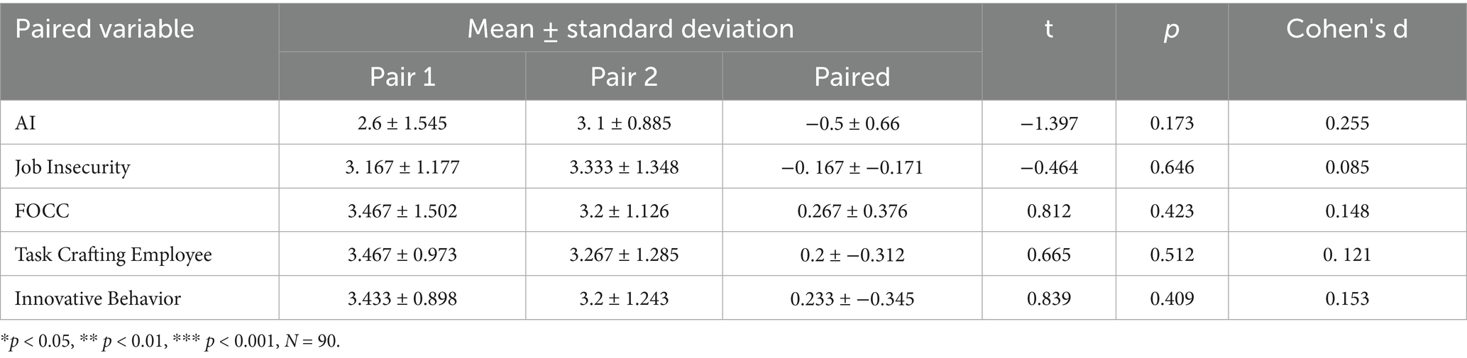 Tables 10–12 show the results of the manipulation checks that were performed in this study using paired samples T-tests. Prior to and following the experiment, there were no significant differences in the control group, as indicated by the p-values for the following dimensions: AI technology adoption (p = 0.173), job insecurity (p = 0.646), FOCC (p = 0.423), task crafting (p = 0.512), and employee innovative behavior (p = 0.409). The effectiveness of the intervention "varying degrees of task crafting" was demonstrated by the p-values for AI technology application (p = 0.035), job insecurity(p = 0.000), and employee innovative behavior (p = 0.027) in experimental group 1, as well as the p-value for FOCC (p = 0.054), which was less than 0.1 and indicated differences before and after the experiment; the p-value for task crafting (p = 0.141) was greater than 0.1, indicating no significant change in this dimension; and the p-values for AI technology adoption (p = 0.000), job insecurity (p = 0.043), and FOCC (p = 0.012) were all less than 0.05, as well as the p-value for employee innovative behavior (p = 0.062), which was less than 0.1 in experimental group 2.