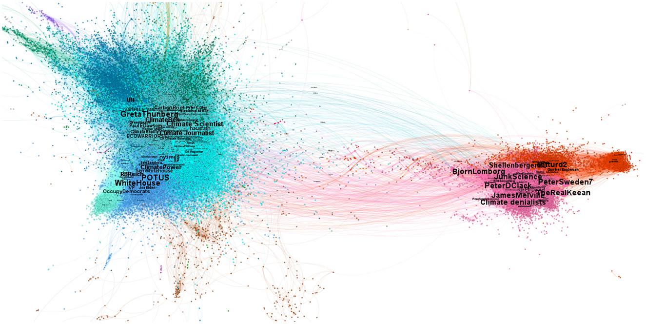 The resulting graph was made of 30,000 nodes and 362,000 links. On one hand, these included international organizations (UN, COPX, UNICEF, NASA, etc.), climate activists (Greta Thunberg, Greenpeace, etc.) and communities centered on US Democrats: the left wing of the Democratic Party - around Bernie Sanders and Alexandria Ocasio-Cortez - and the mainstream Democratic party around Joe Biden, Kamala Harris and Barack Obama. On the other hand, the denialist communities feature Donald Trump's supporters and “Make America Great Again” (MAGA) Republicans, accompanied by other right-wing political leaders such as those of the United Kingdom Independence Party, and communities of influencer “experts” in climate science, who have their own audience and are densely connected to each other. It is in this latter denialist community that one finds accounts like JunkScience (Steve Milloy) notoriously supported by the fossil fuel industries such as the Heart Land Institute or the Competitive Enterprise Institute. In Figure 1, we show the resulting network using (Jacomy et al., 2014) for the spatial visualization. This algorithm employs a force-directed layout that minimizes the distance between nodes with strong connections and increases the distance between nodes with weaker connections. Visually, we observe the formation of two distinct clusters: on one hand, nodes in cool colors for which central nodes correspond to pro-climate users, on the other hand, nodes in warm colors where central nodes correspond to climate change denialists. Colors are based on the Louvain CDA (Blondel et al., 2008), which gives an initial overview of the network structure.