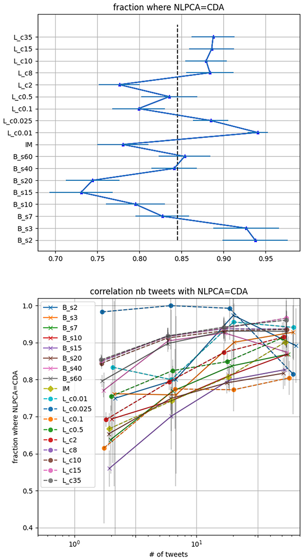 On the lower panel of Figure 3, we display the fraction of user where the NLPCA agrees with the CDA as a function of the number of tweets made by users in the testing set. The binning of tweets number is logarithmic. The first bin corresponds to [1, 3] tweets, second to a number between [4, 10], third to [11, 31], and then ≥32 tweets. As expected, it is more challenging to classify a user based on a few tweets compared to a larger number of tweets. However it is still quite impressive to see an agreement at ~85% for several CDA, considering that [1, 3] tweets can characterize a randomly selected user. Then we observe that the agreement increases with the number of tweets. The decrease of some curves is not statistically significant as the number of users who posted more than 15 tweets reduces to less than 10 in some cases. Poisson errors are displayed in light gray on the figure.