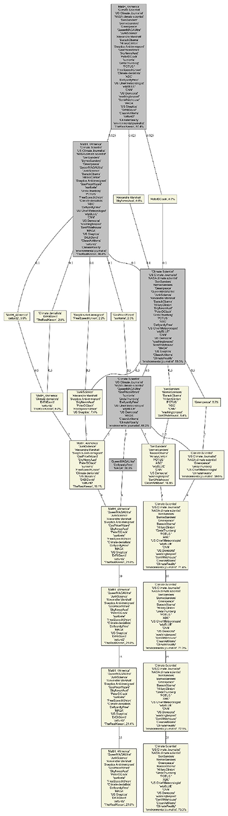 Infomap does not provide a scale parameter, the four biggest communities cover 32.5% of all users. These communities, as displayed in Figure 6, are easy to interpret. The largest (14.8%) corresponds to pro-climate activists, scientist and media. The second (8.1%) corresponds to climate denialists that focus on denying that CO2 and fossil fuel are the cause of climate change. The third (5.5%) corresponds to Democrats and some mainstream media, while the fourth (4.1%) corresponds to communities around MAGA influencers for whom climate change is a“hoax” or a“cult.”